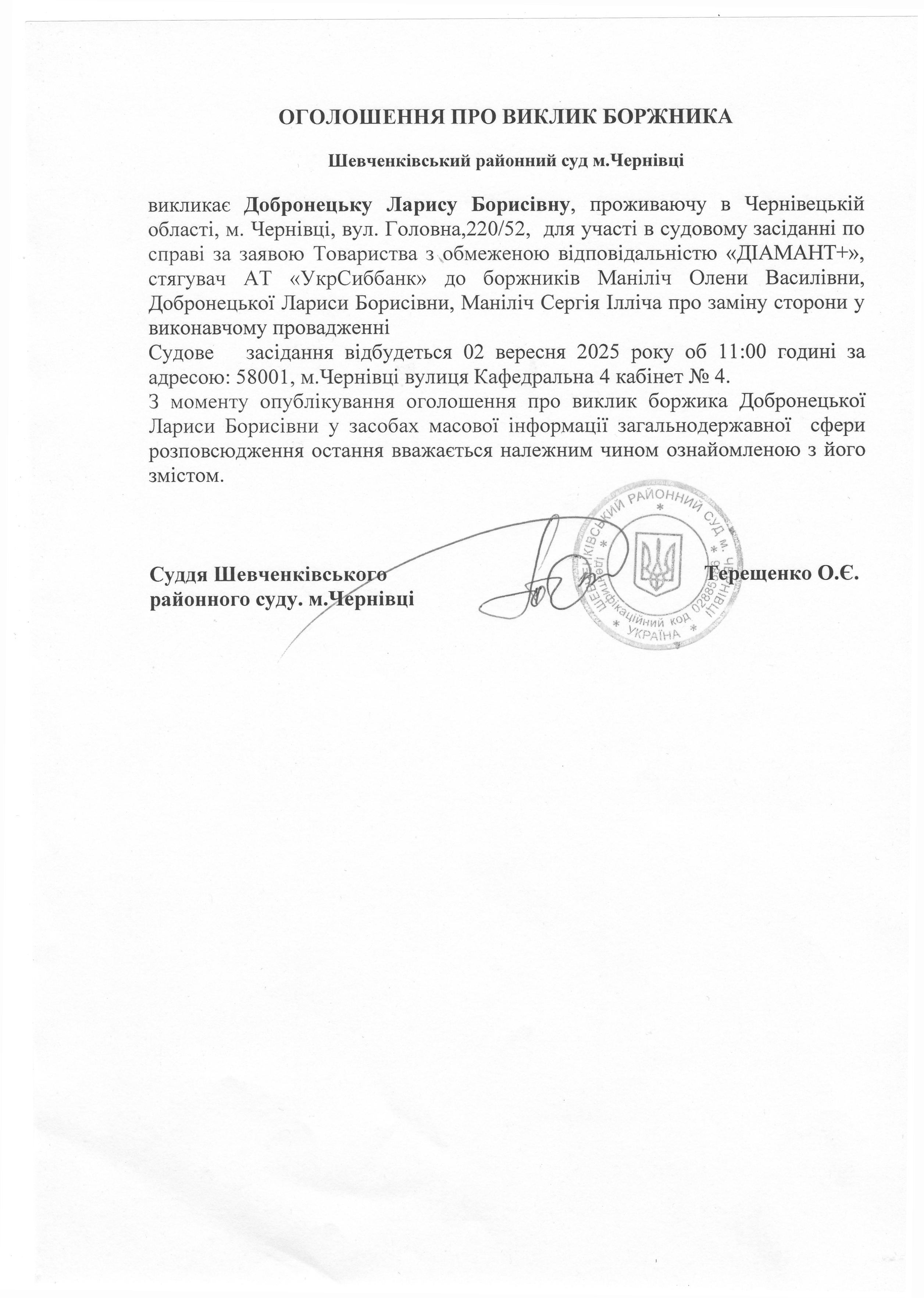 Оголошення про виклик до суду Добронецьку Ларису Борисівну