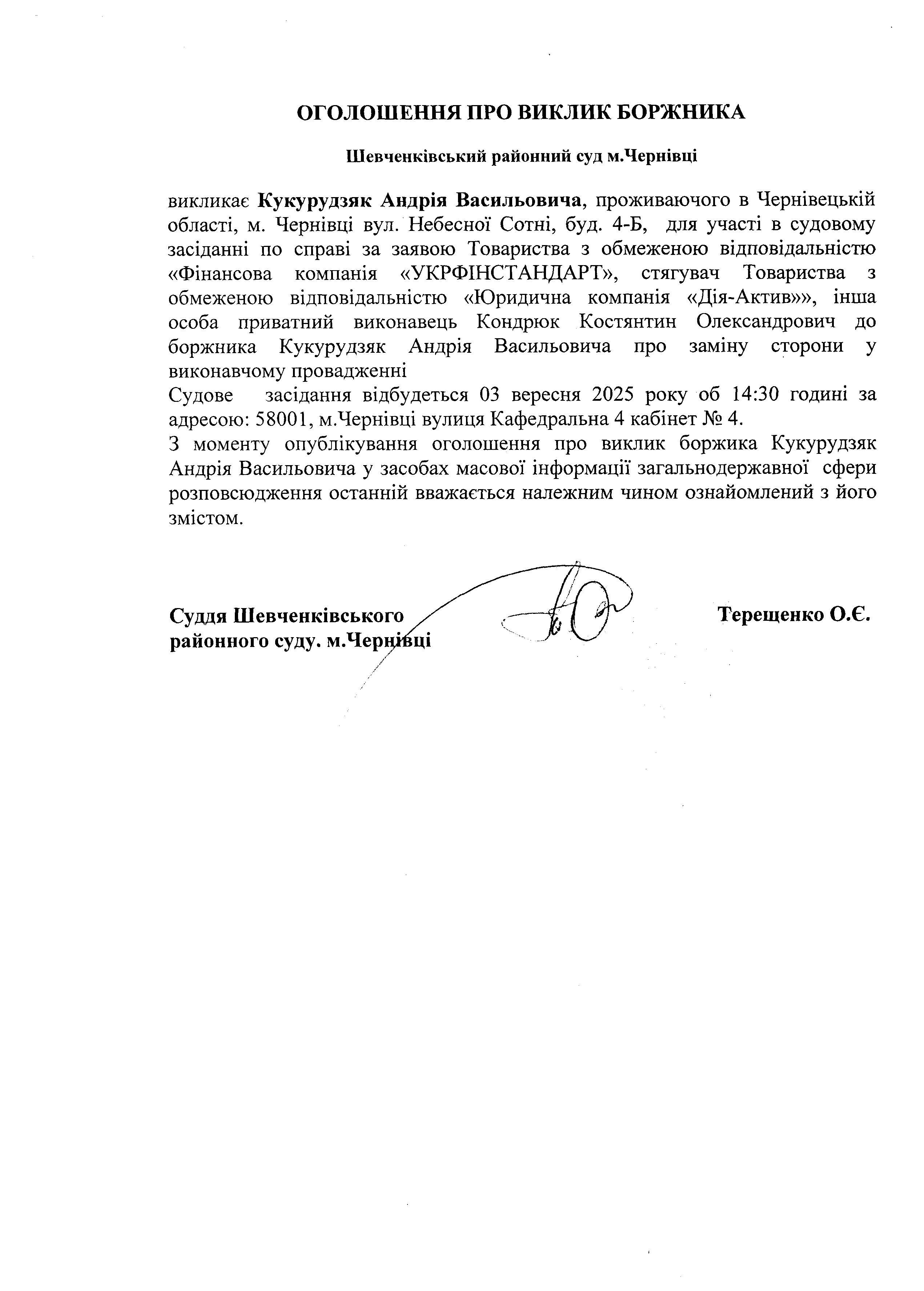 Оголошення про виклик до суду Кукурудзяк Андрія Васильовича