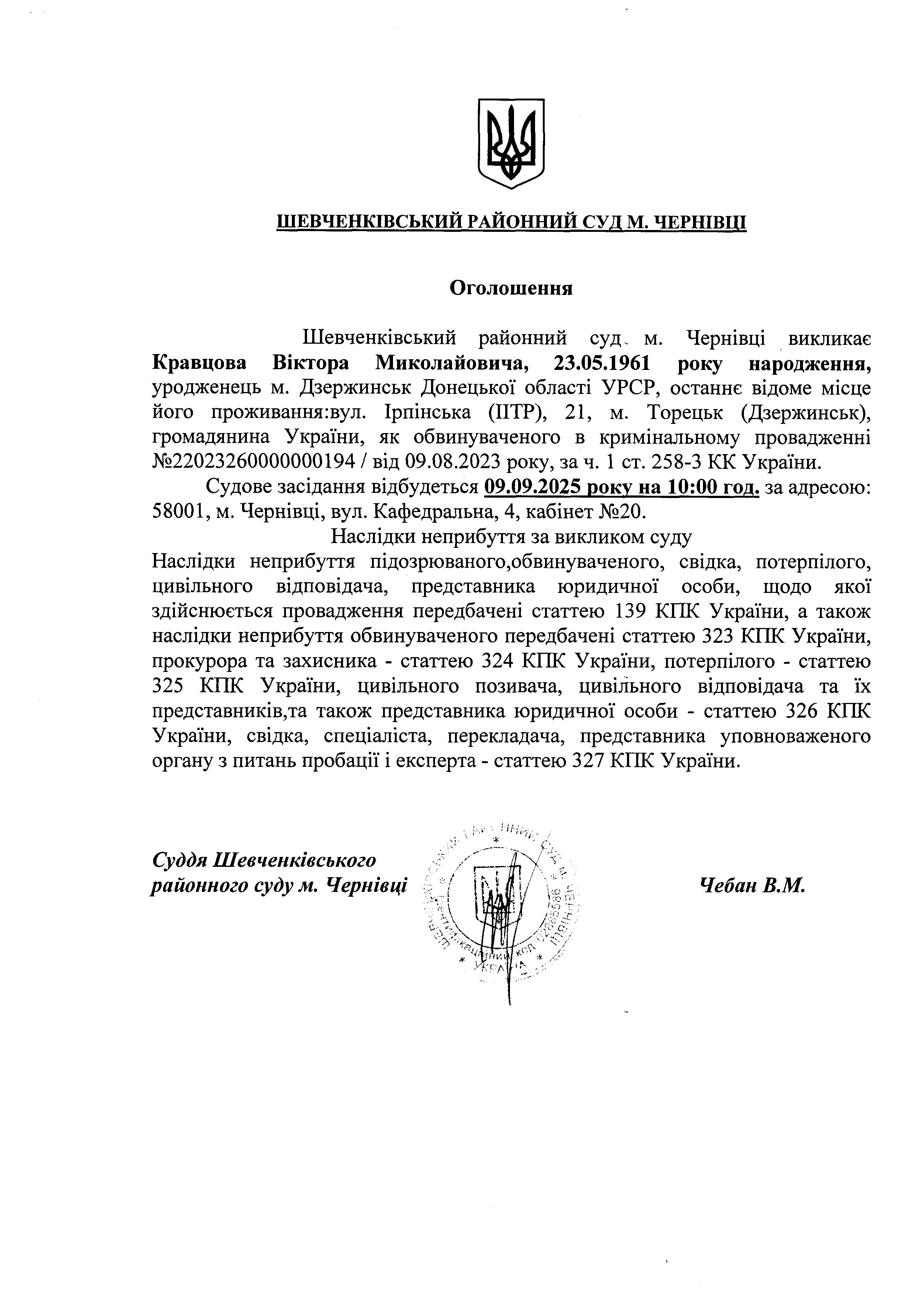 Оголошення про виклик до суду Кравцова Віктора Миколайовича