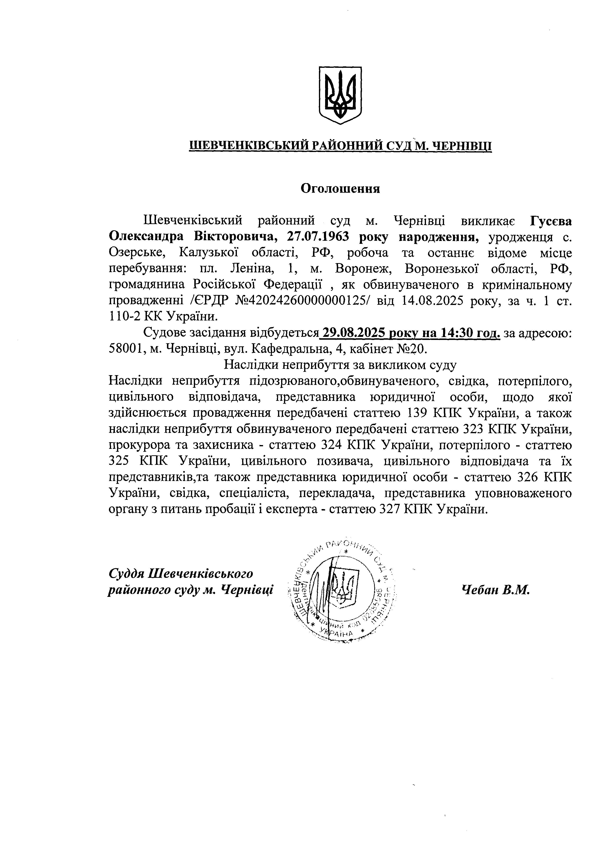 Оголошення про виклик до суду Гусєва Олександра Вікторовича