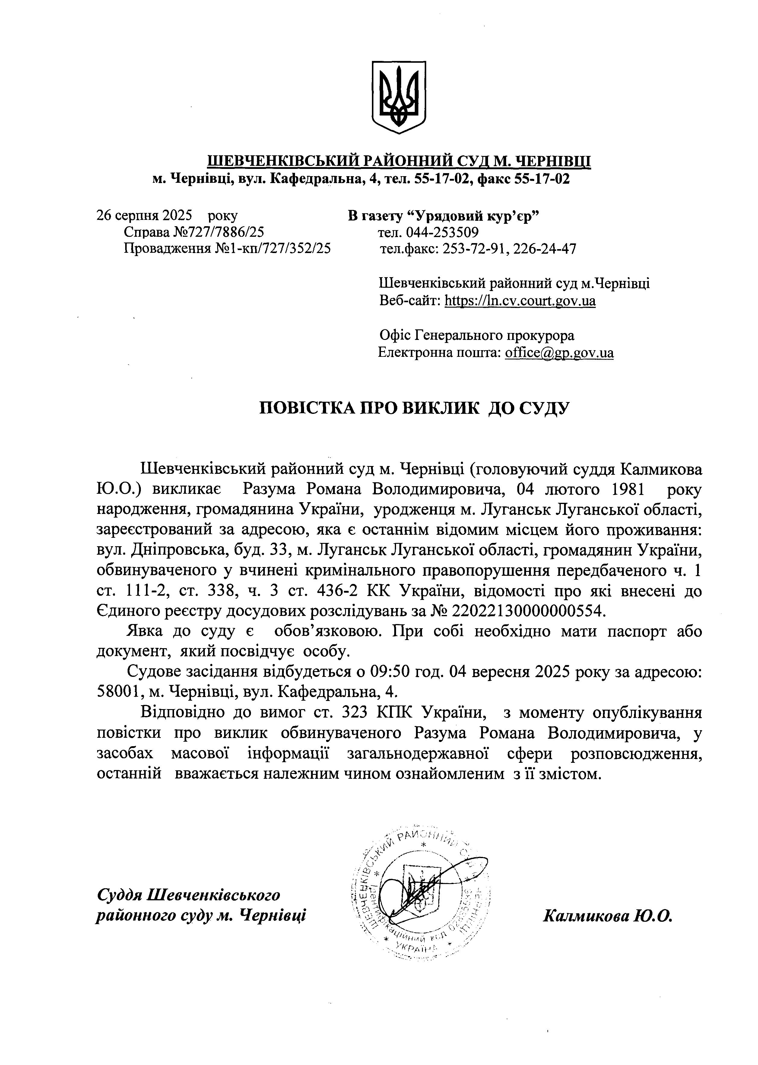 Повістка про виклик до суду Каліматов Махмуда-Алі Макшариповича