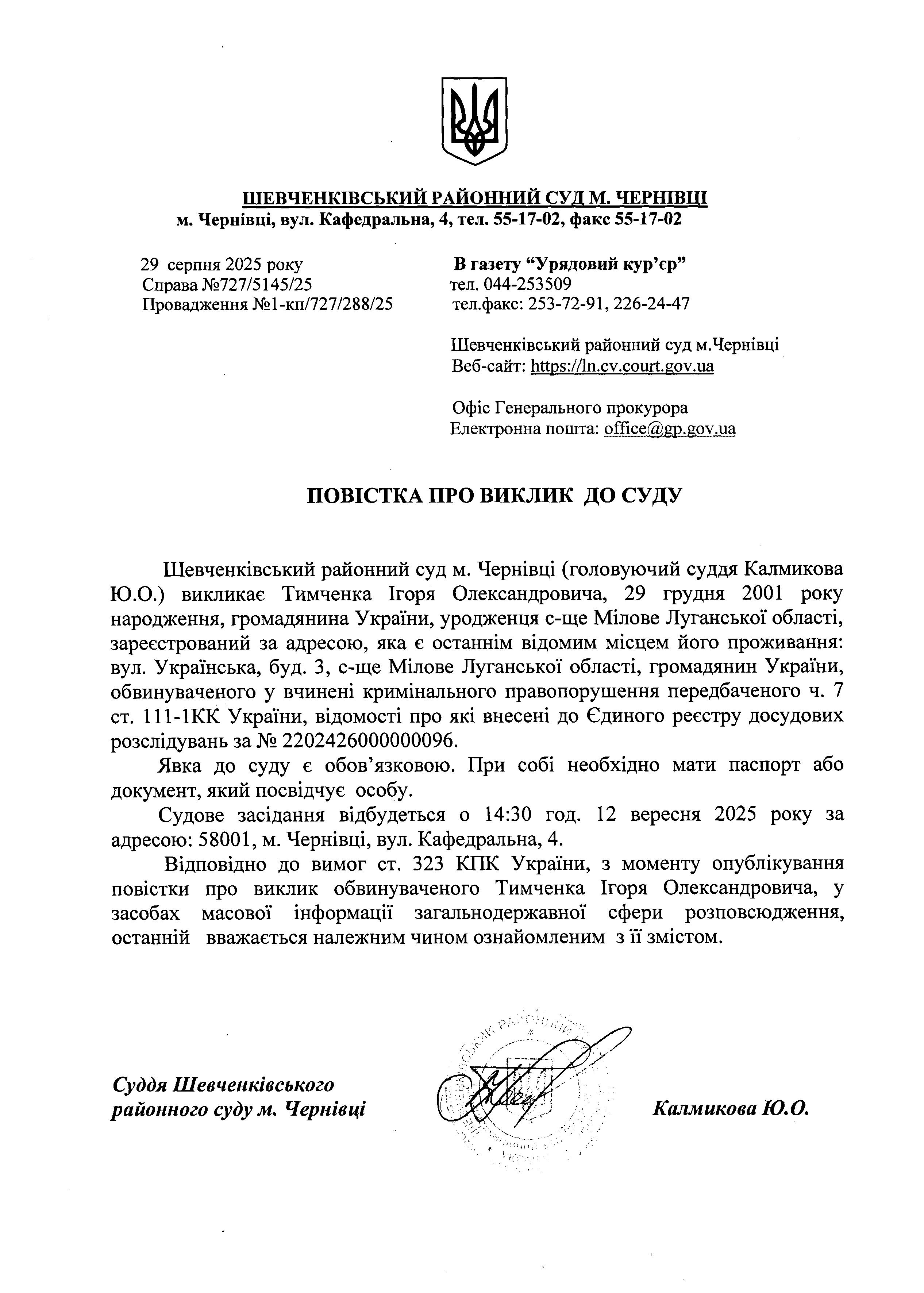 Повістка про виклик до суду Тимченка Ігоря Олександровича