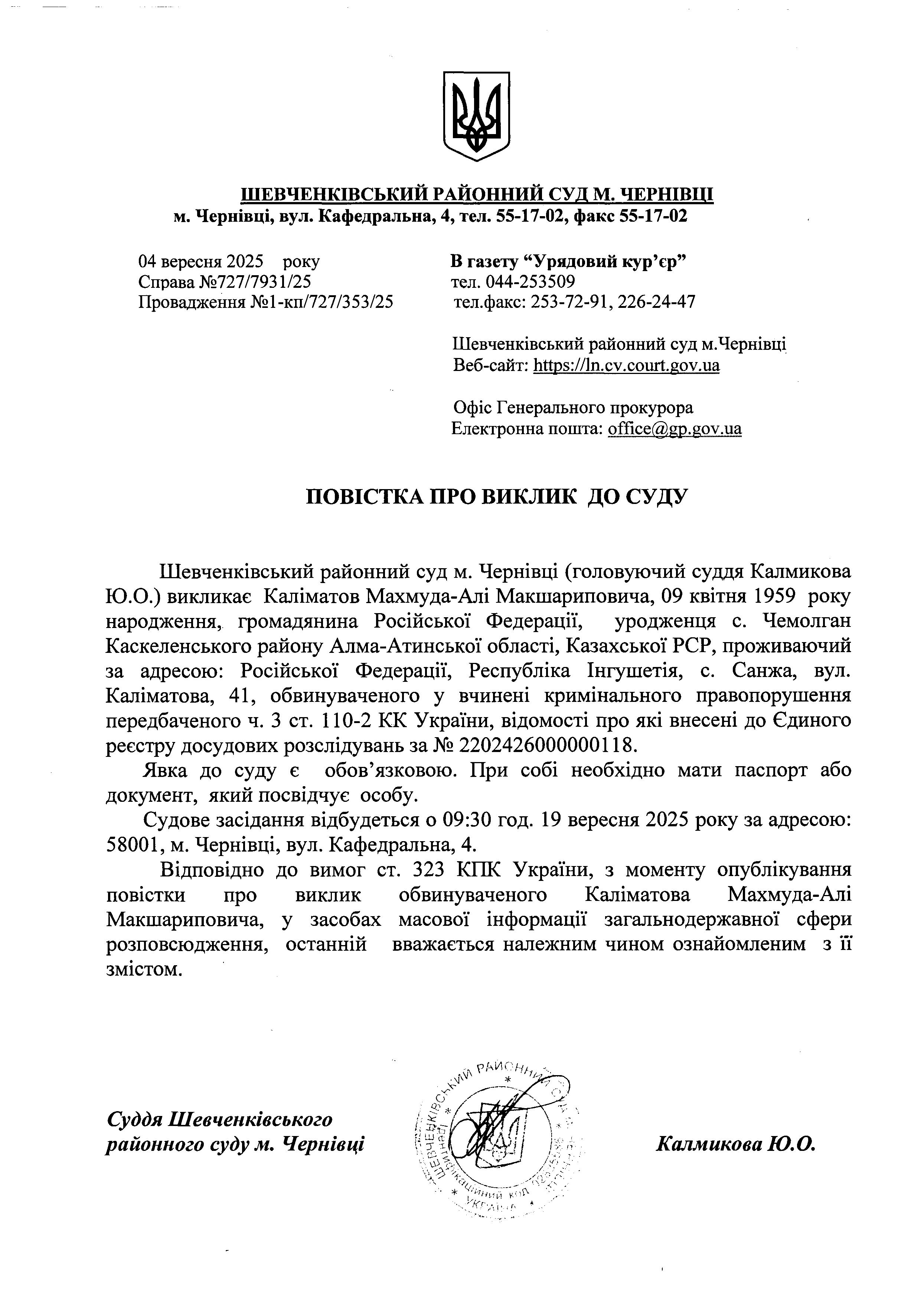 Повістка про виклик до суду Каліматов Махмуда-Алі Макшариповича