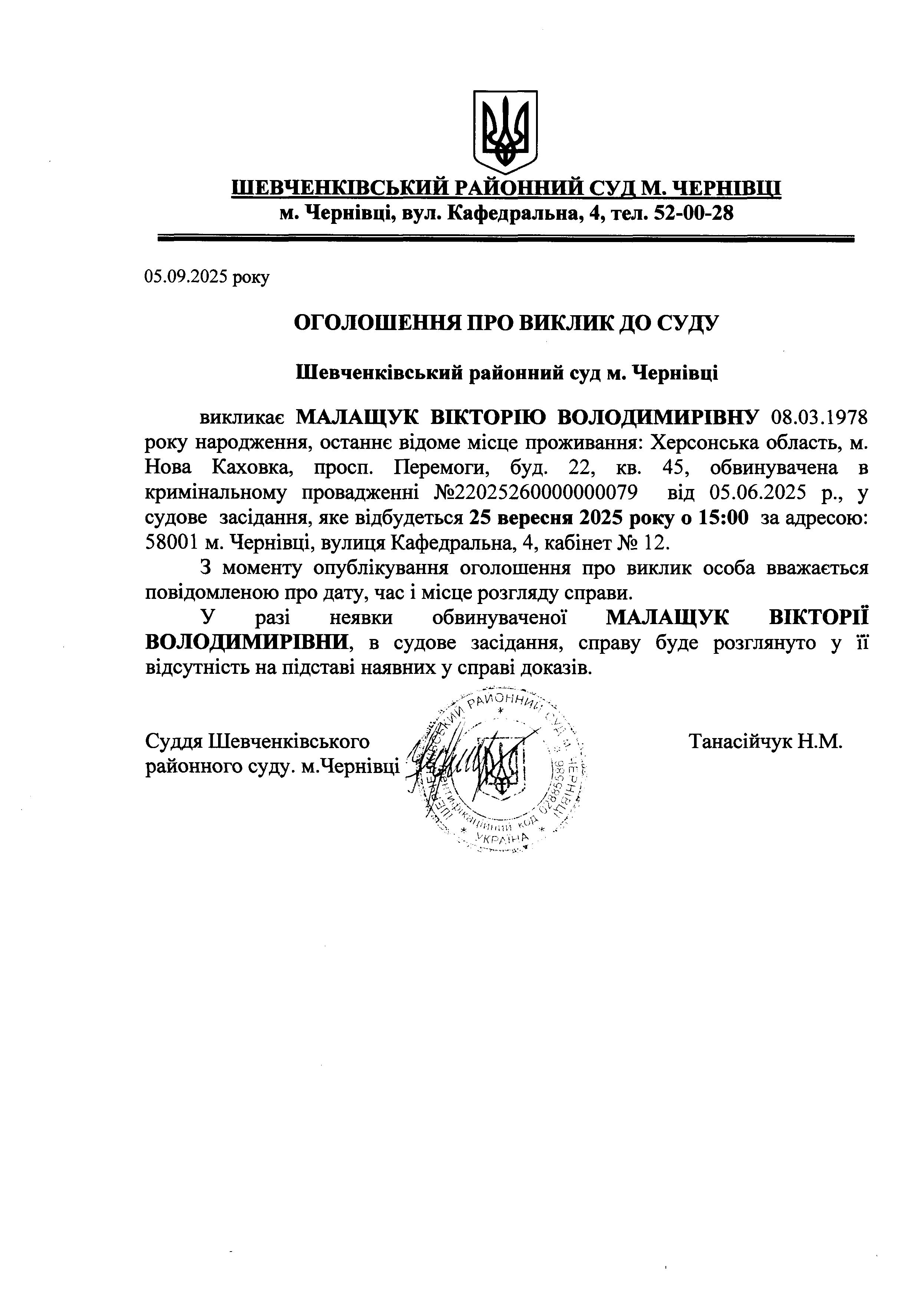Оголошення про виклик до суду Малащук Вікторію Володимирівну