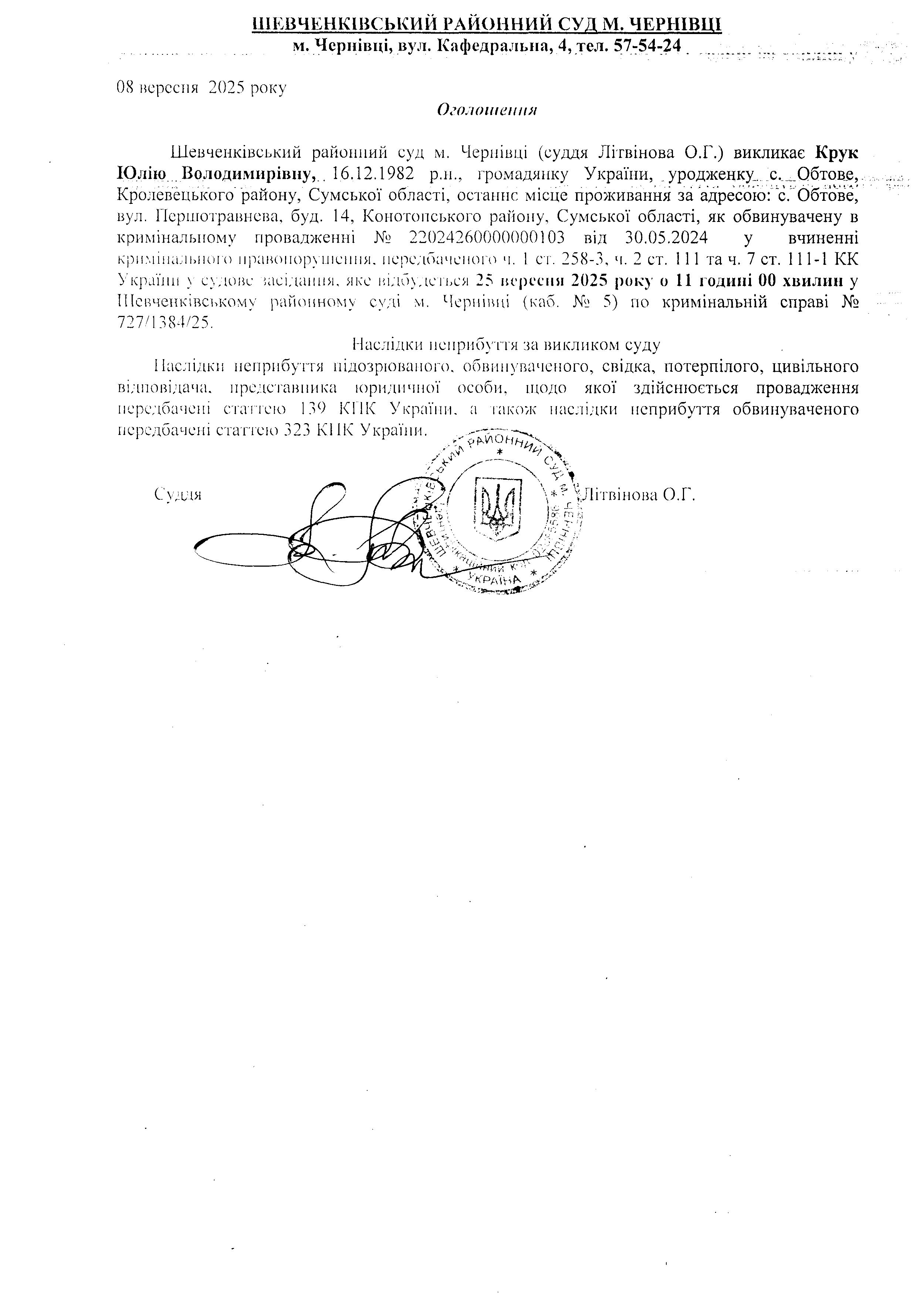 Оголошення про виклик до суду Крук Юлію Володимирівну