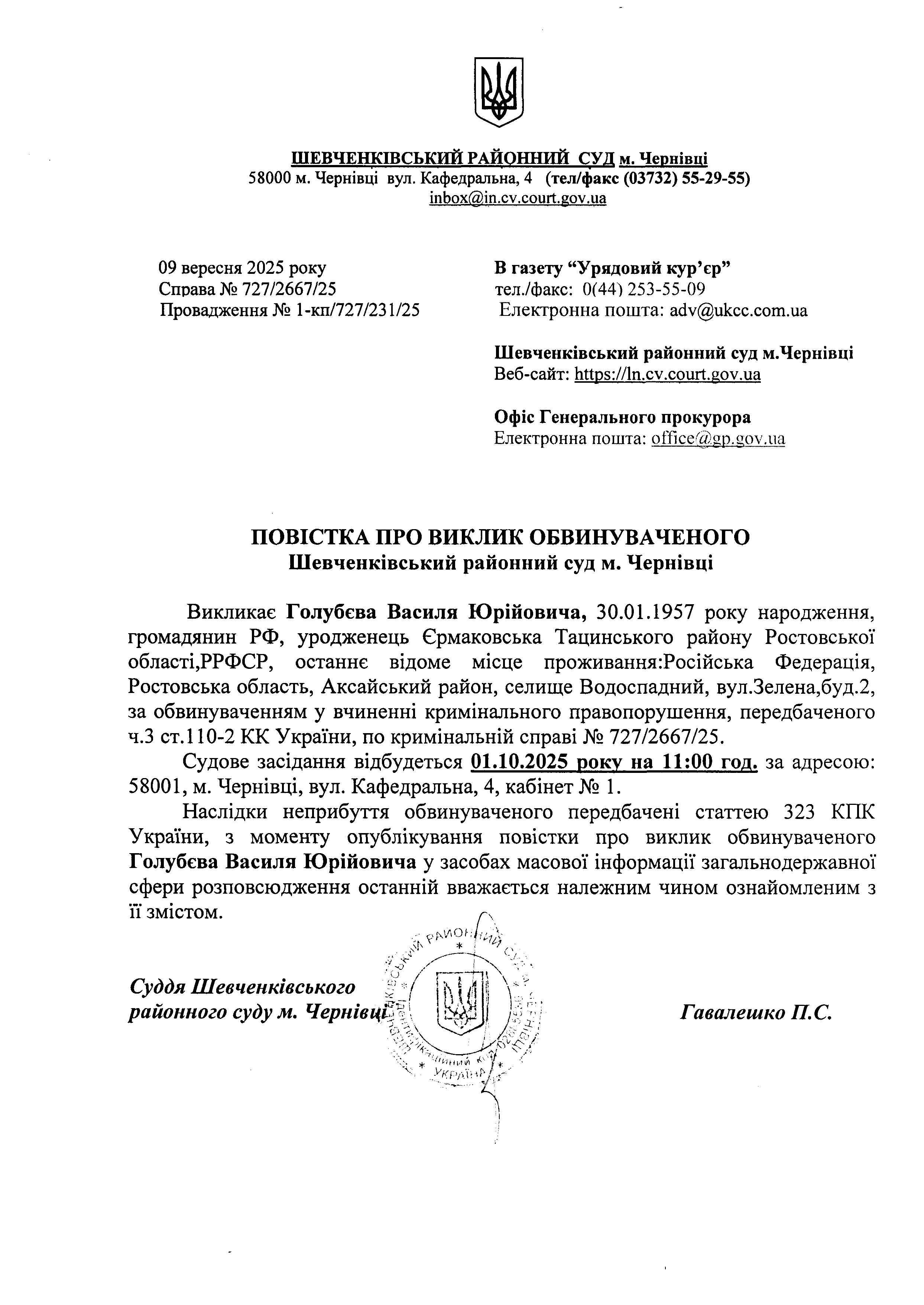 Повістка про виклик до суду Голубєва Василя Юрійовича