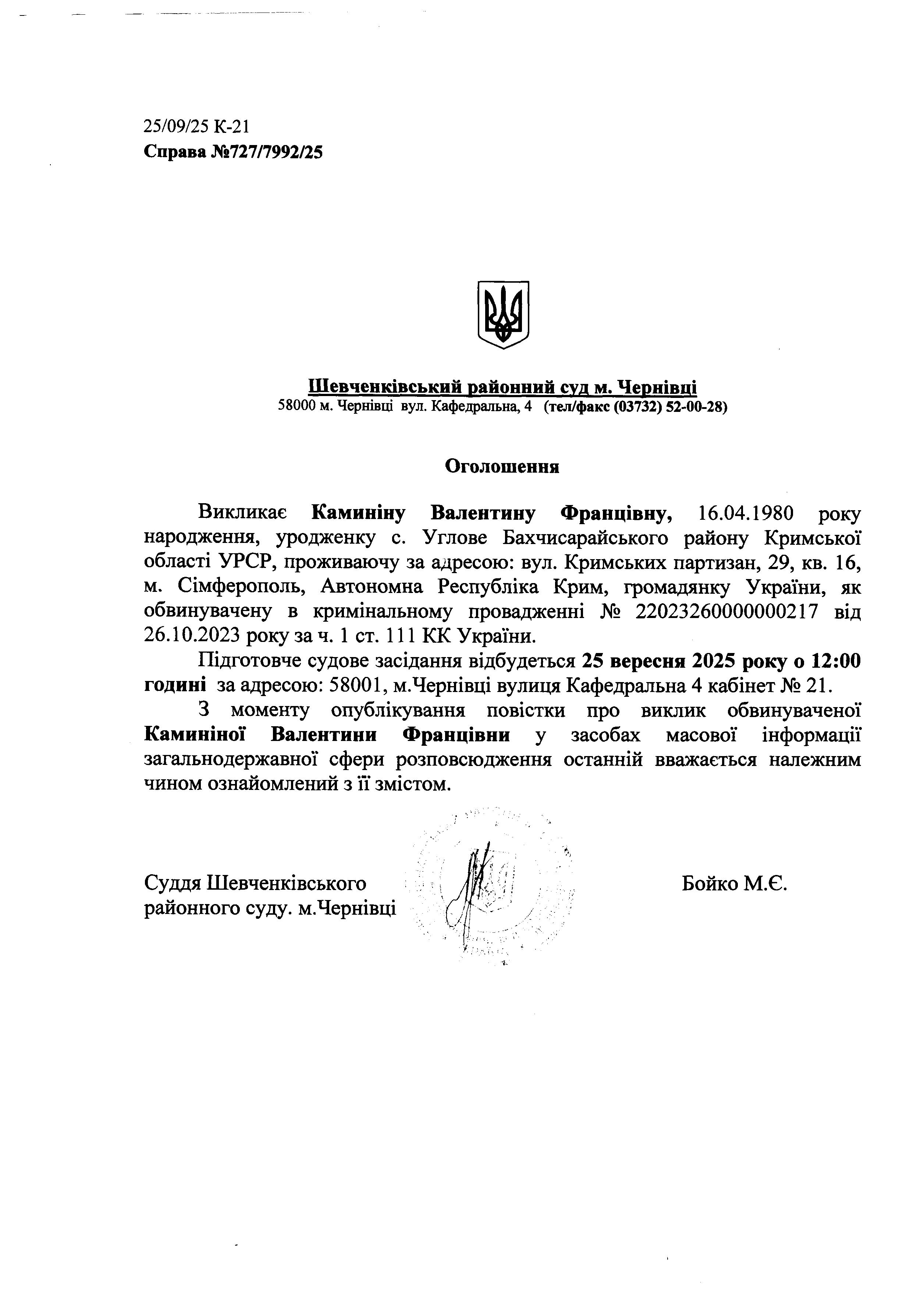 Оголошення про виклик до суду Каминіну Валентину Францівну