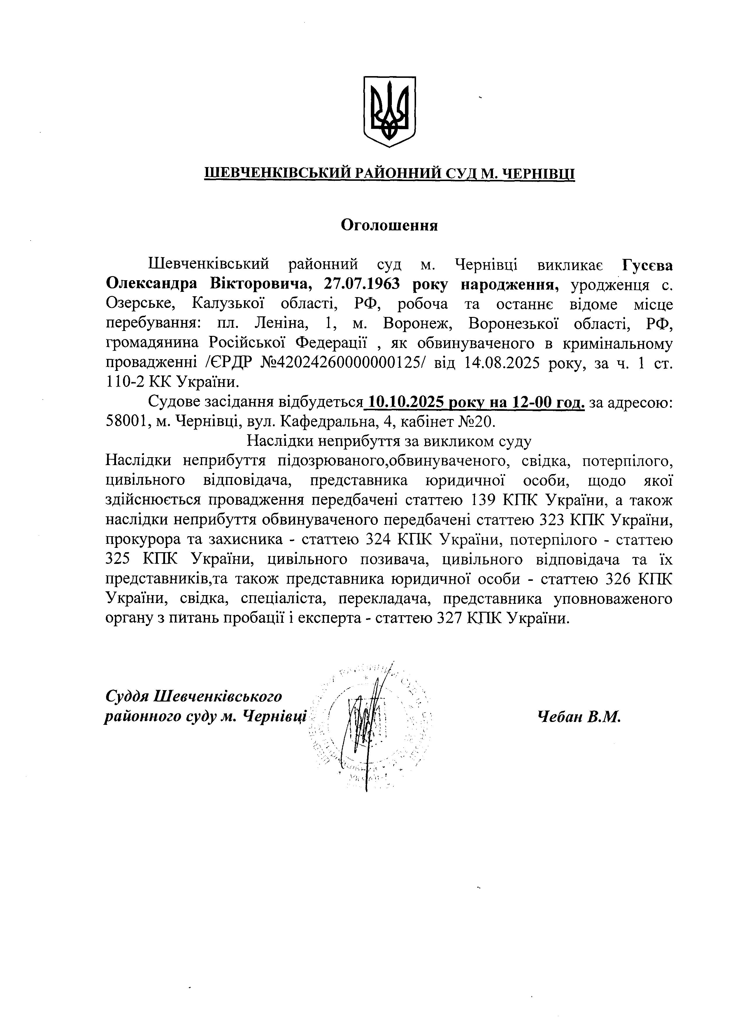 Оголошення про виклик до суду Гусєва Олександра Вікторовича