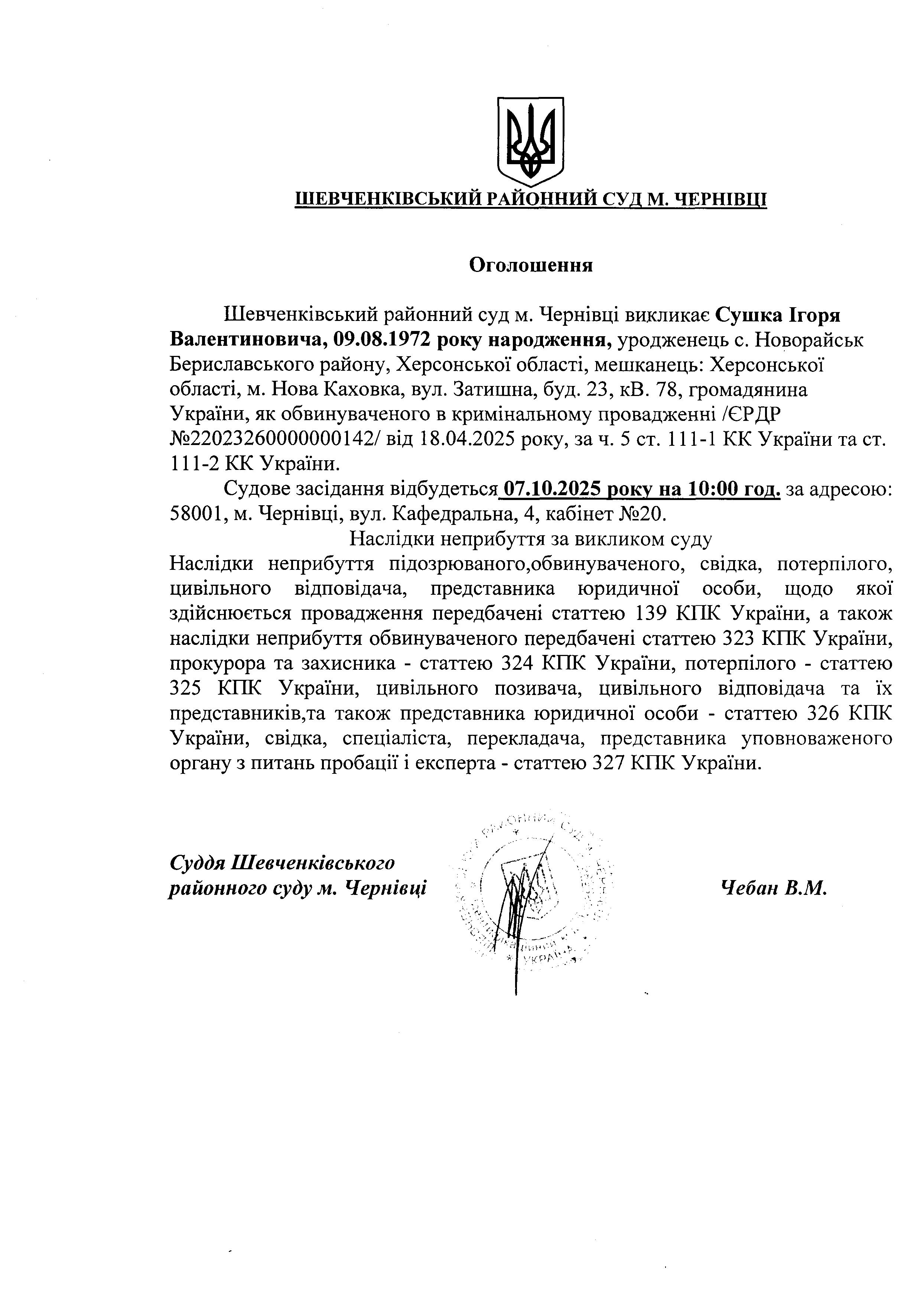 Оголошення про виклик до суду Сушка Ігоря Валентиновича