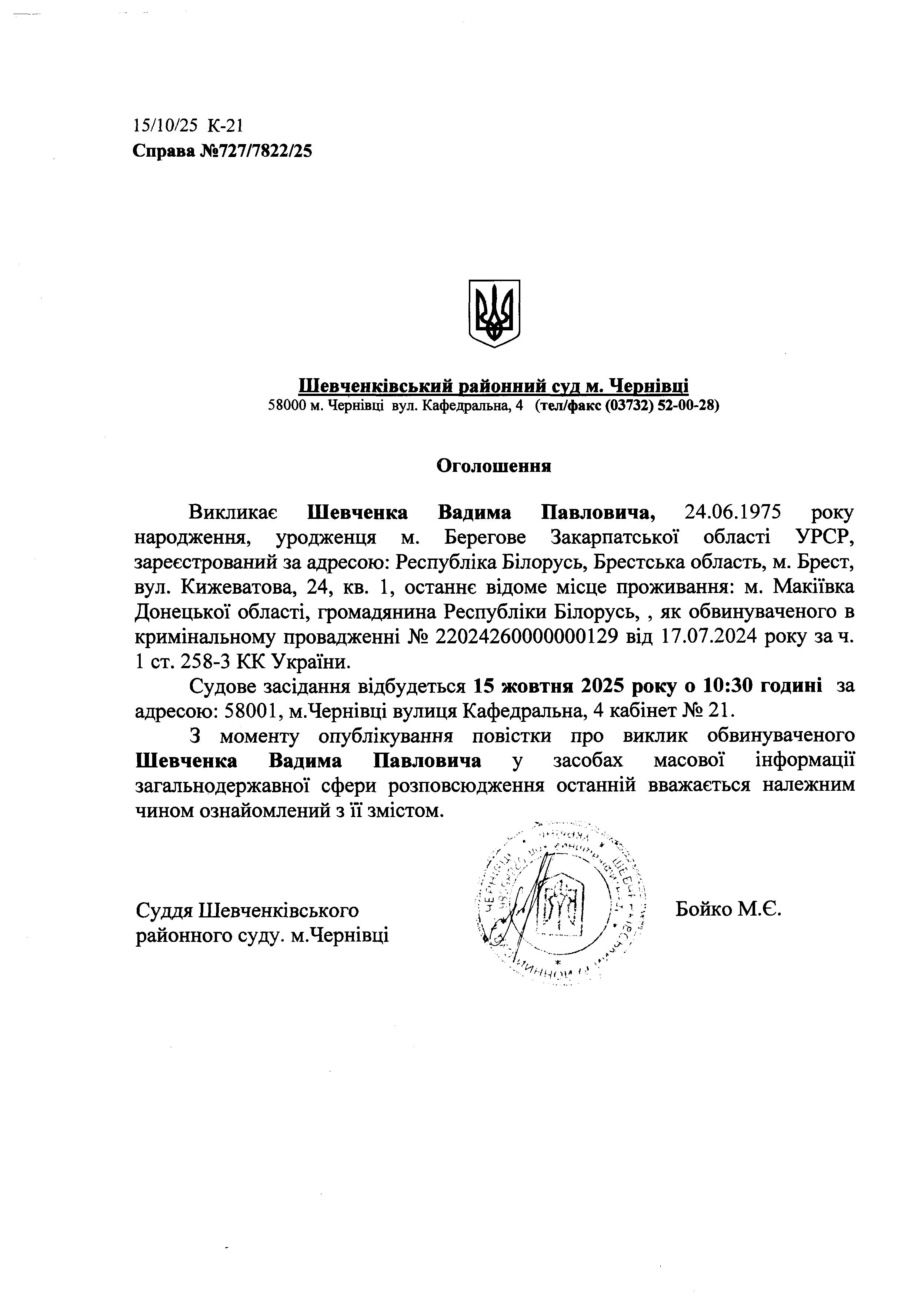 Оголошення про виклик до суду Шевченка Вадима Павловича