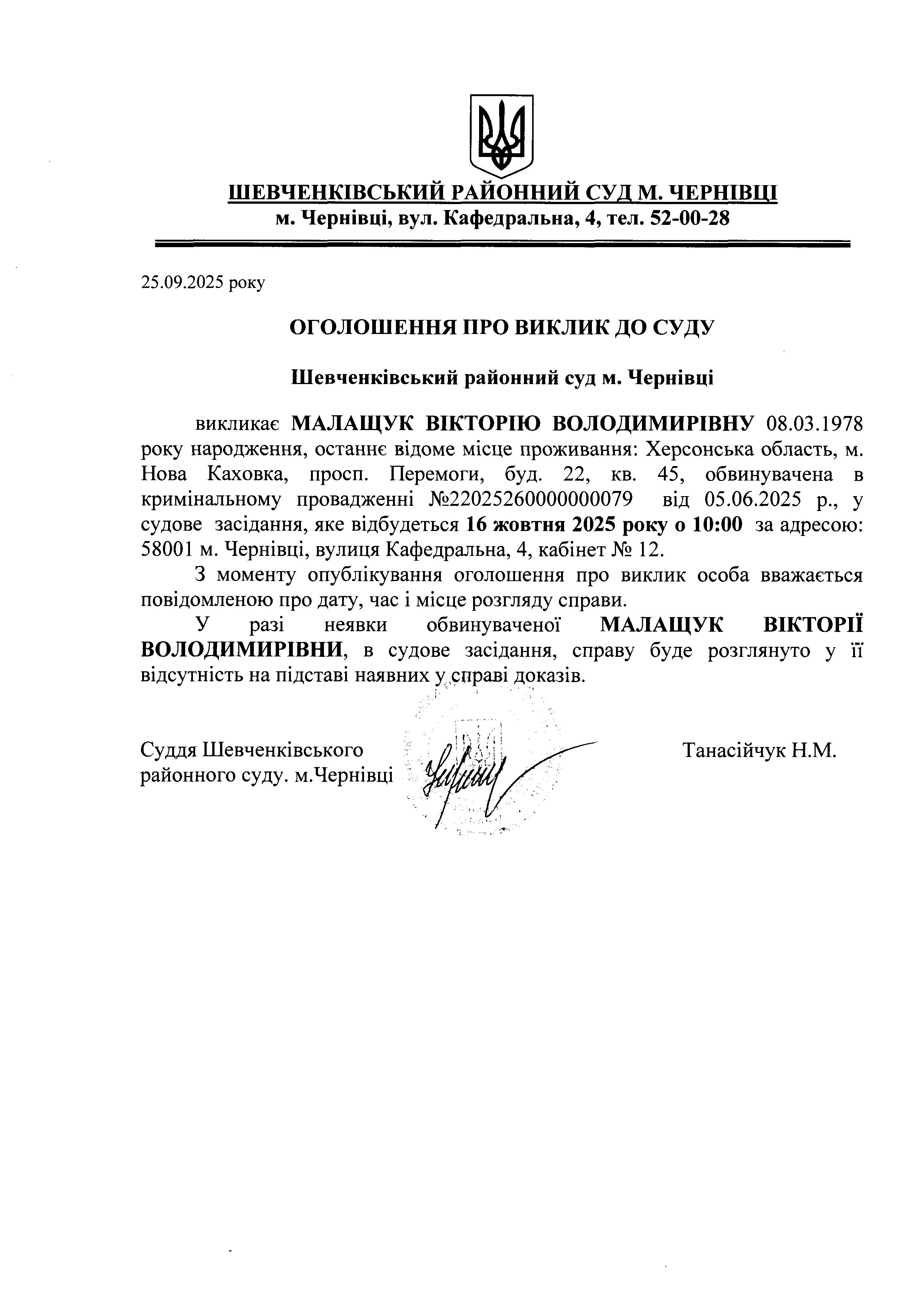 Оголошення про виклик до суду Малащук Вікторію Володимирівну