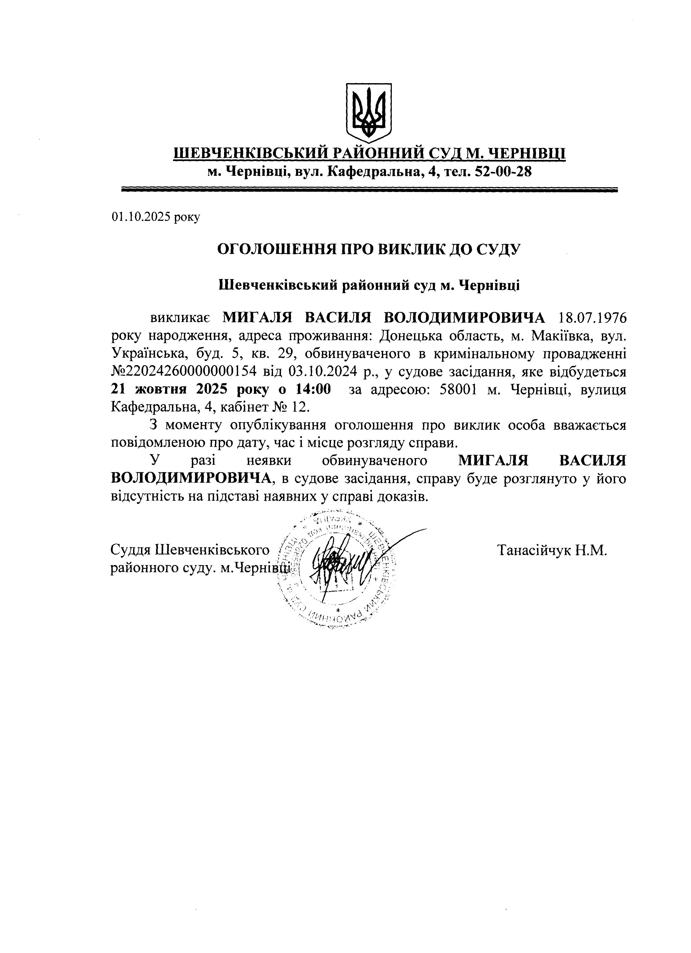 Оголошення про виклик до суду Мигаля Василя Володимировича