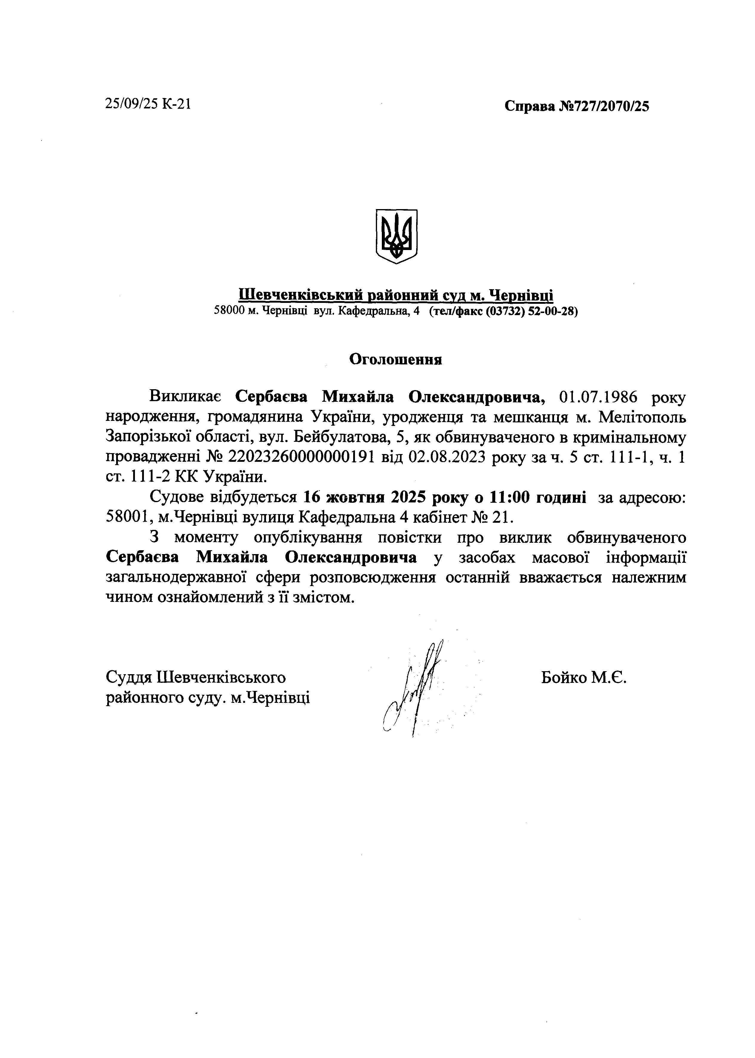 Оголошення про виклик до суду Сербаєва Михайла Олександровича
