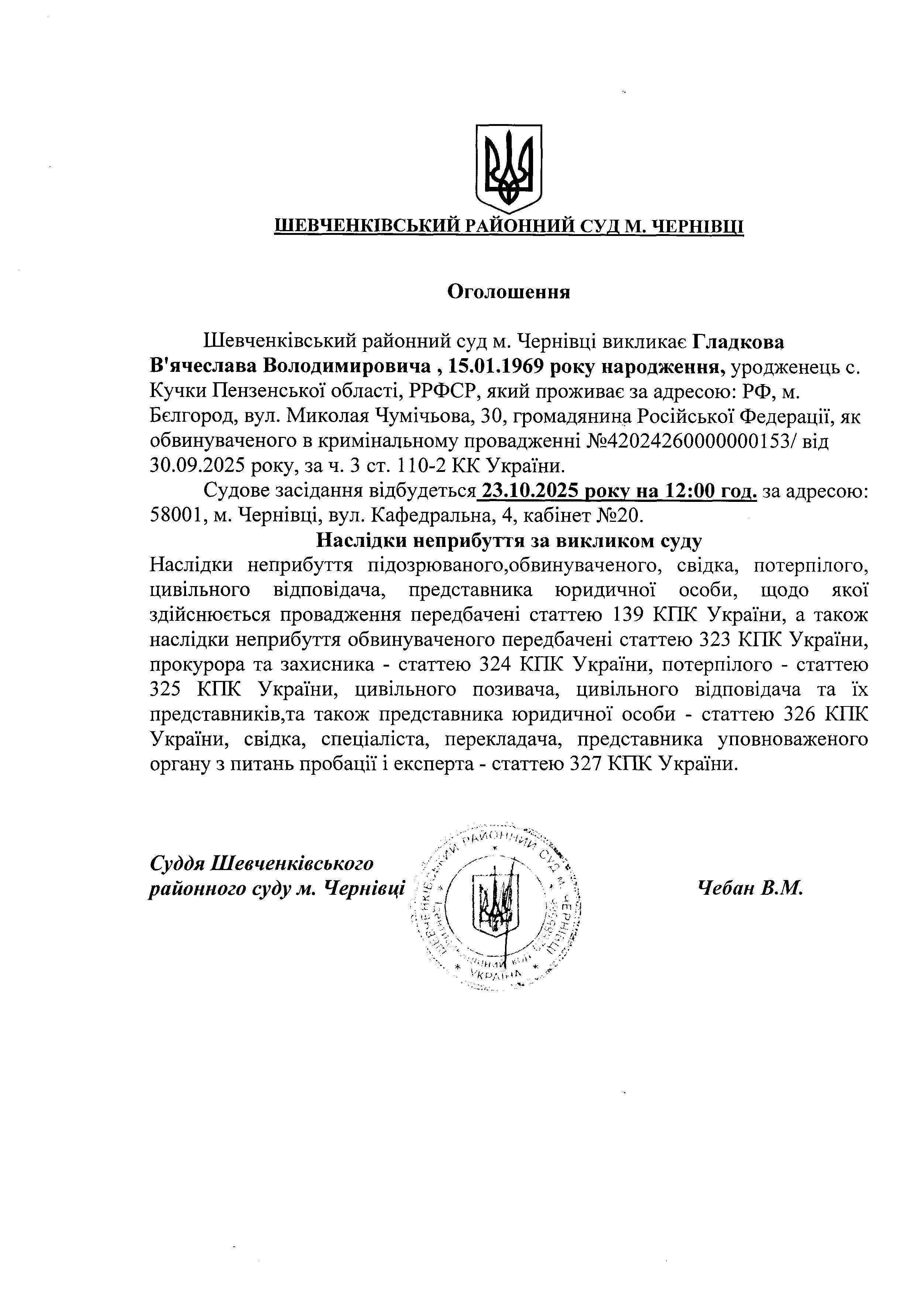 Оголошення про виклик до суду Гладкова В'ячеслава Володимировича