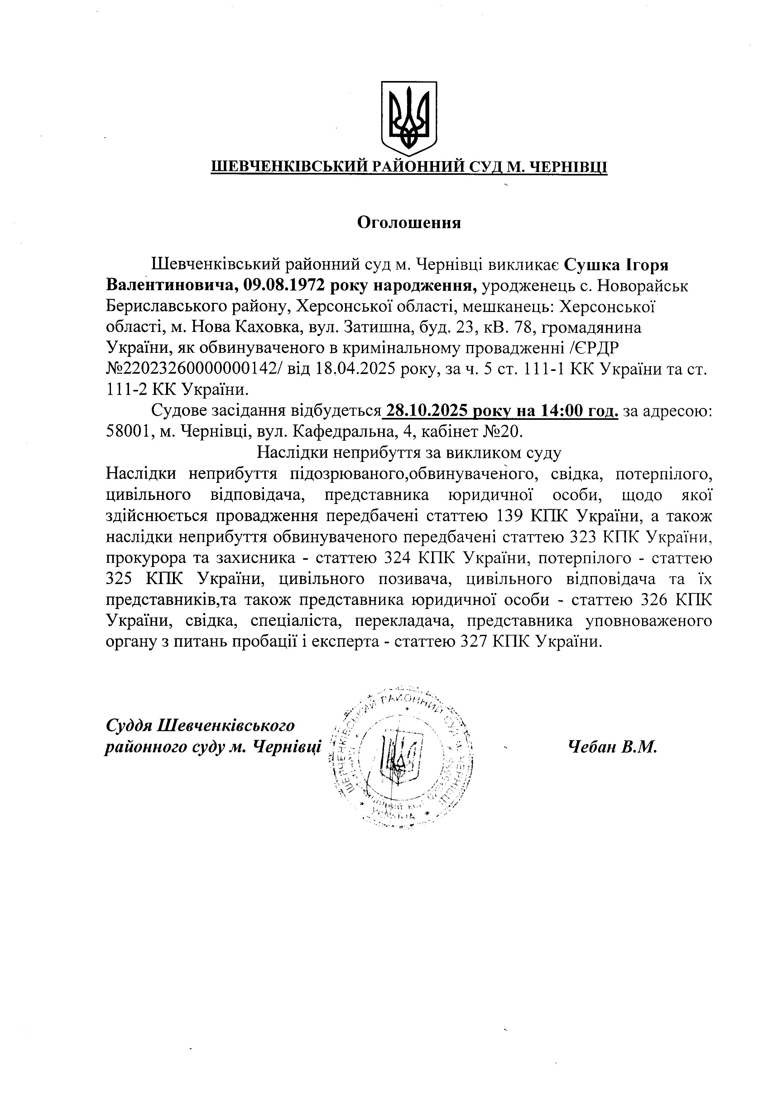 Оголошення про виклик до суду Сушка Ігоря Валентиновича