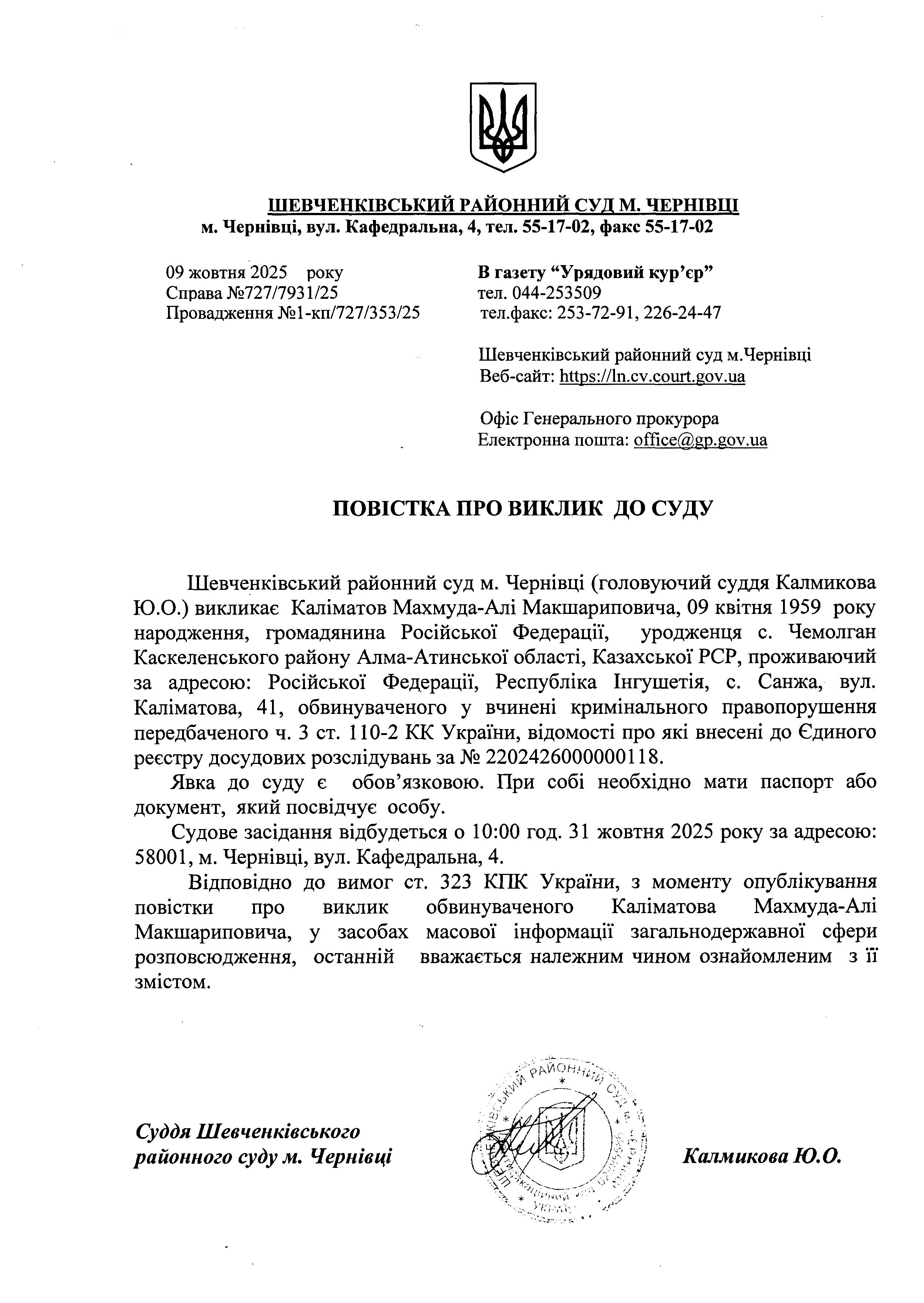 Повістка про виклик до суду Каліматов Махмуда-Алі Макшариповича