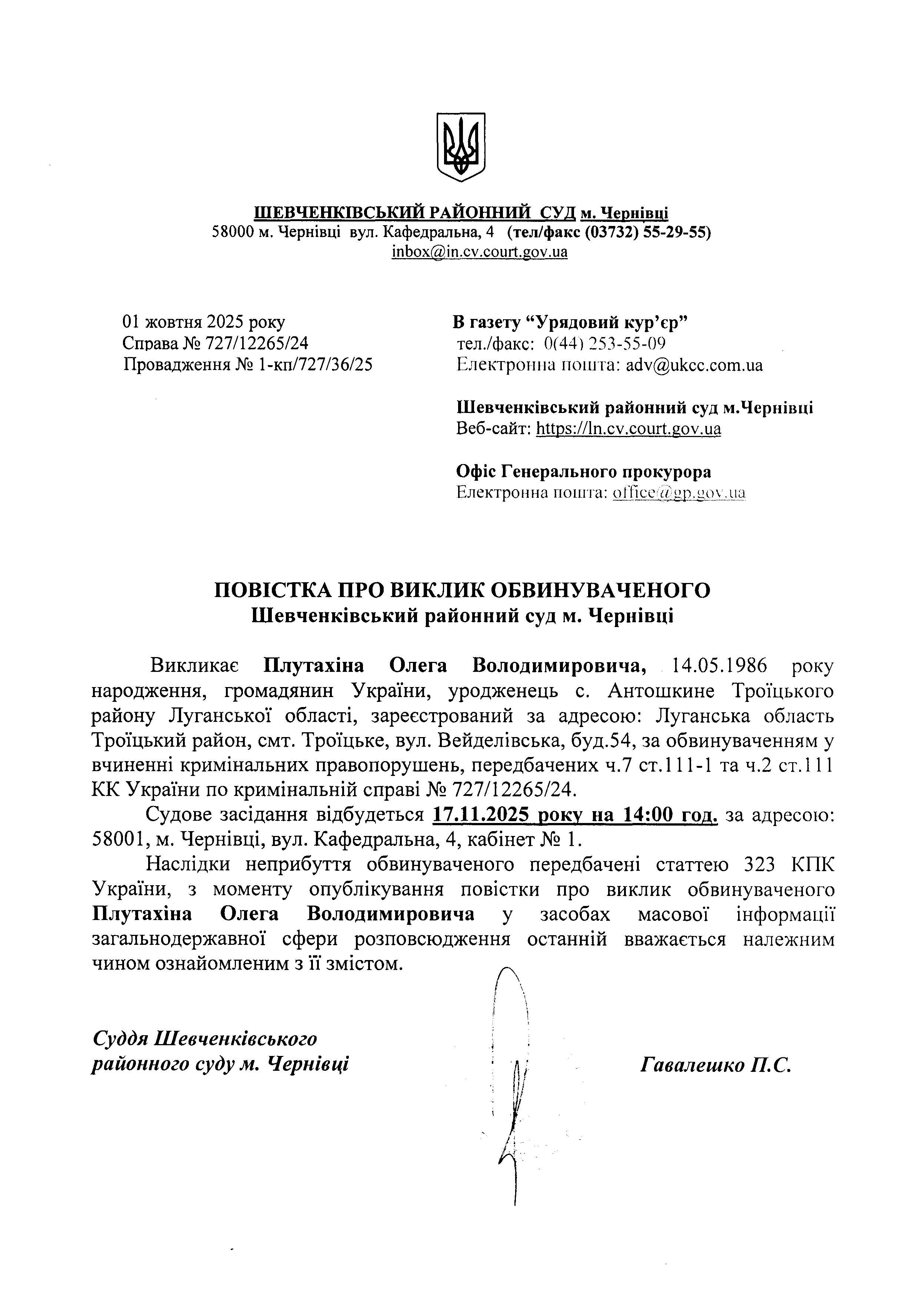 Повістка про виклик до суду Плутахіна Олега Володимировича