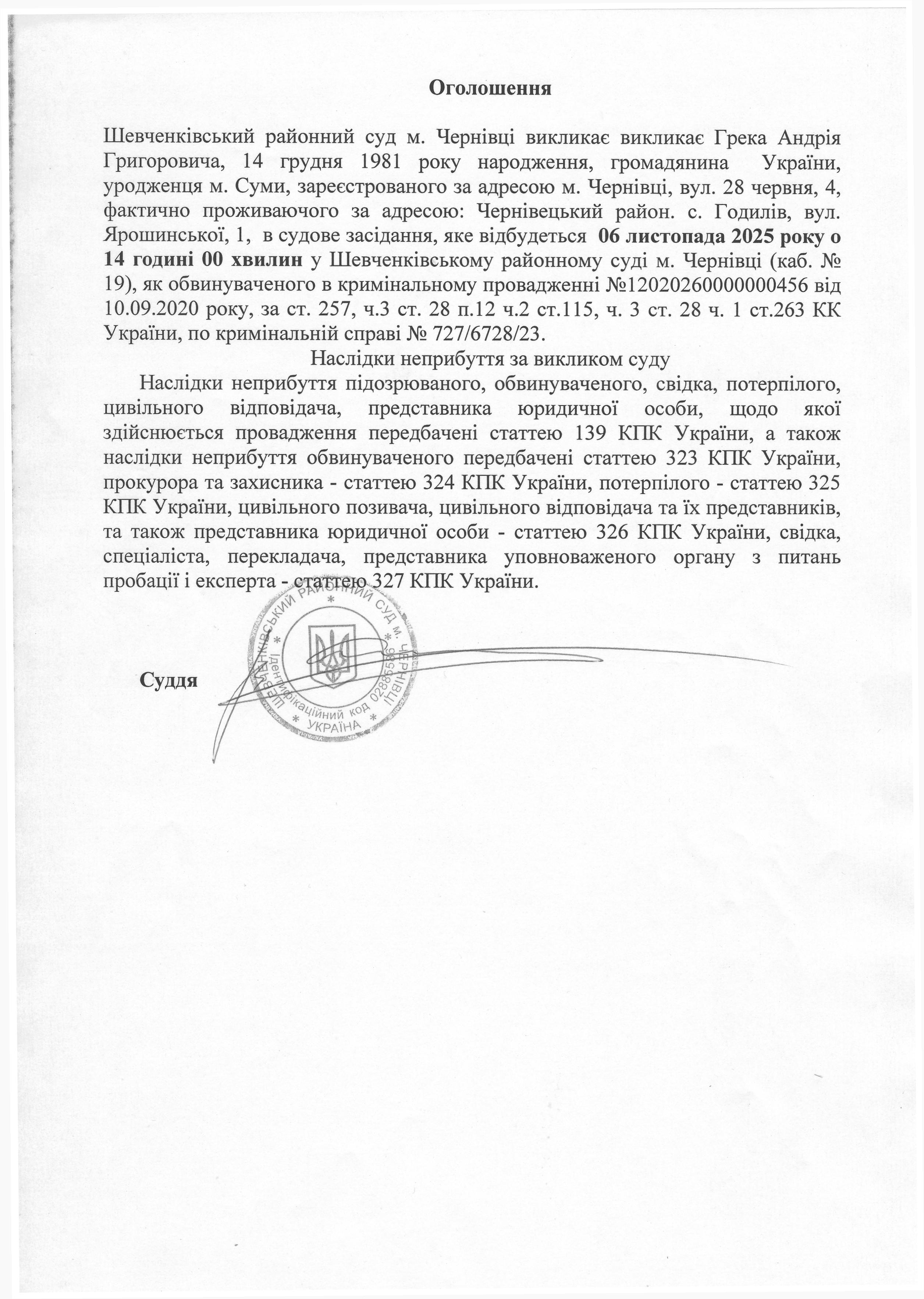 Оголошення про виклик до суду Грека Андрія Григоровича