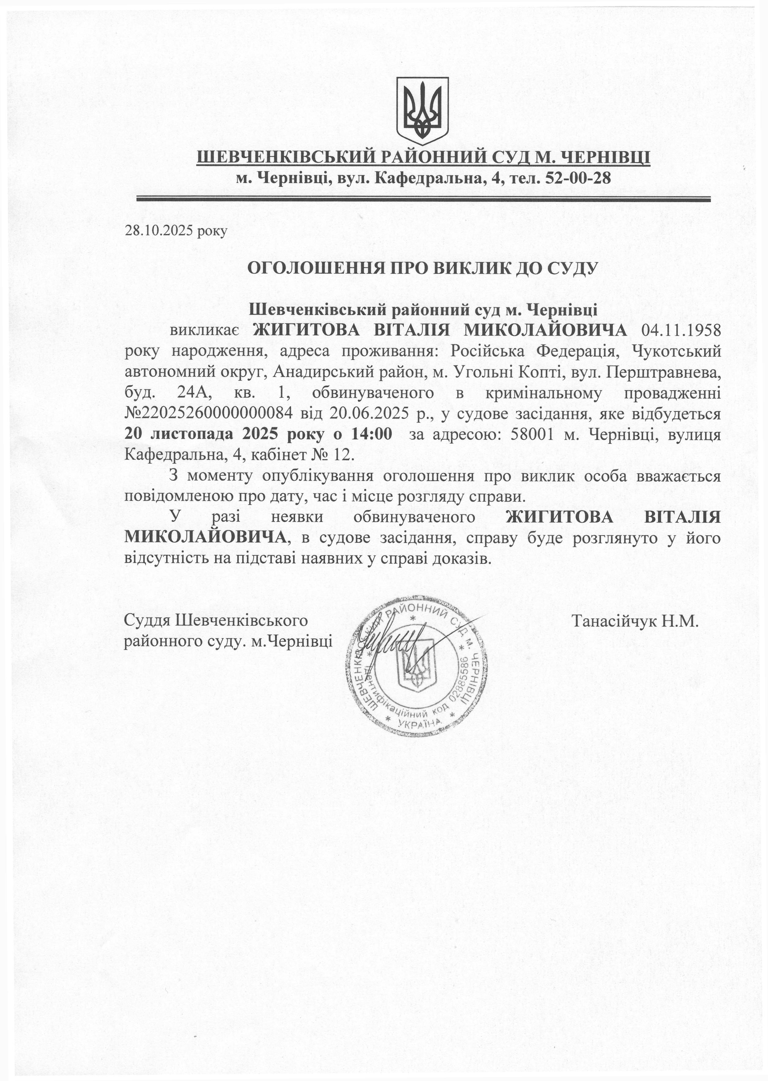 Оголошення про виклик до суду Жигитова Віталія Миколайовича