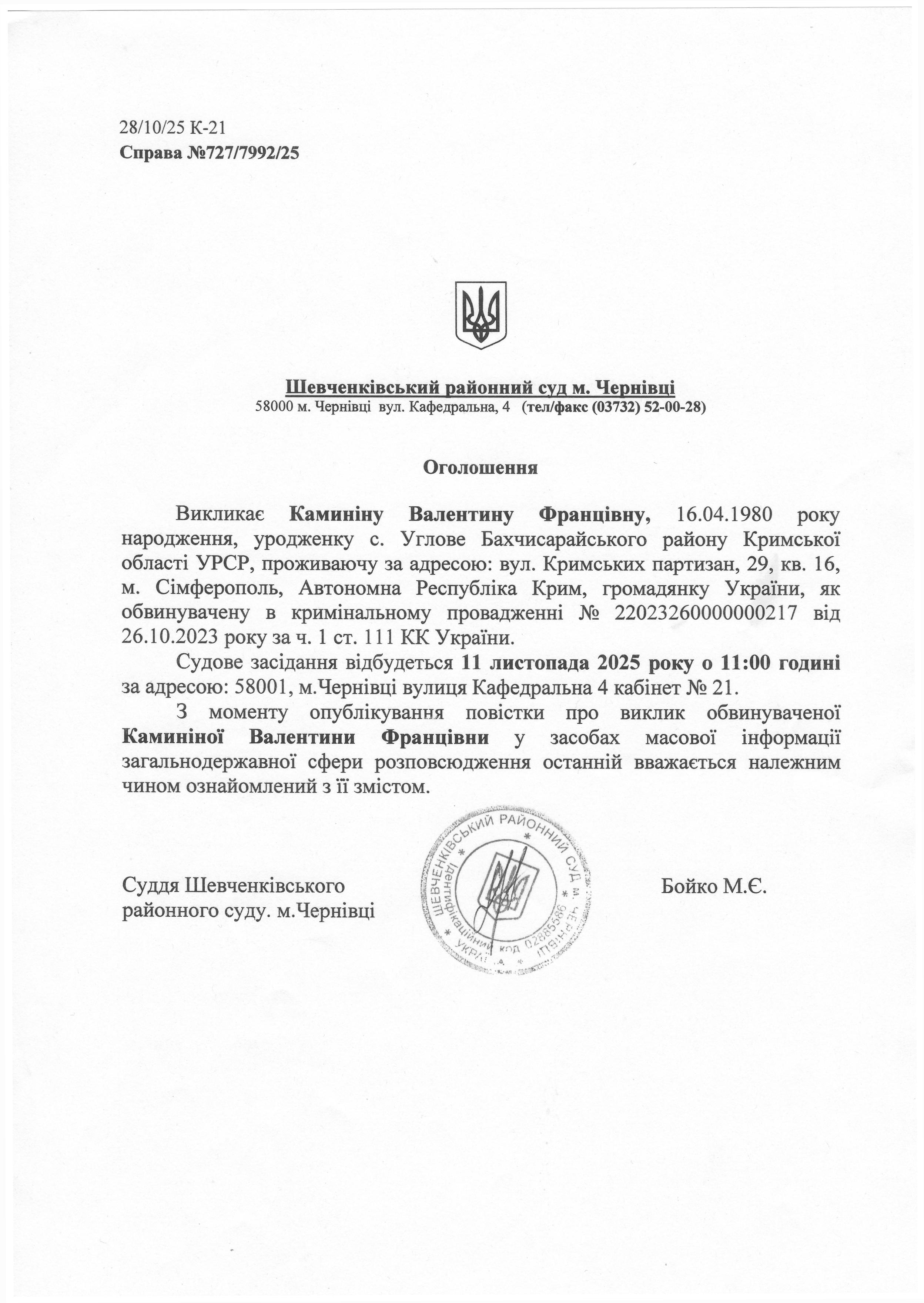Оголошення про виклик до суду Каминіну Валентину Францівну