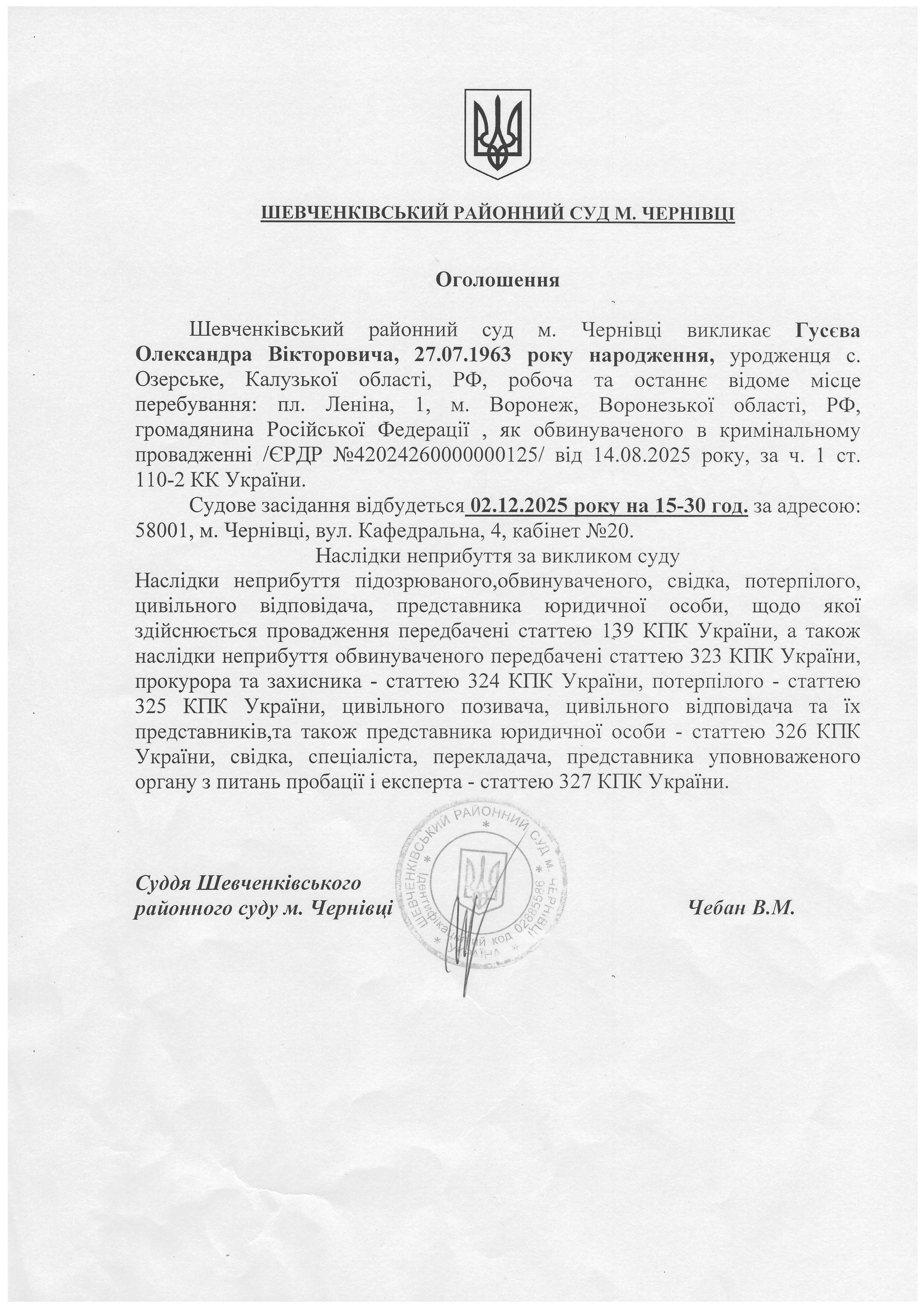Оголошення про виклик до суду Гусєва Олександра Вікторовича