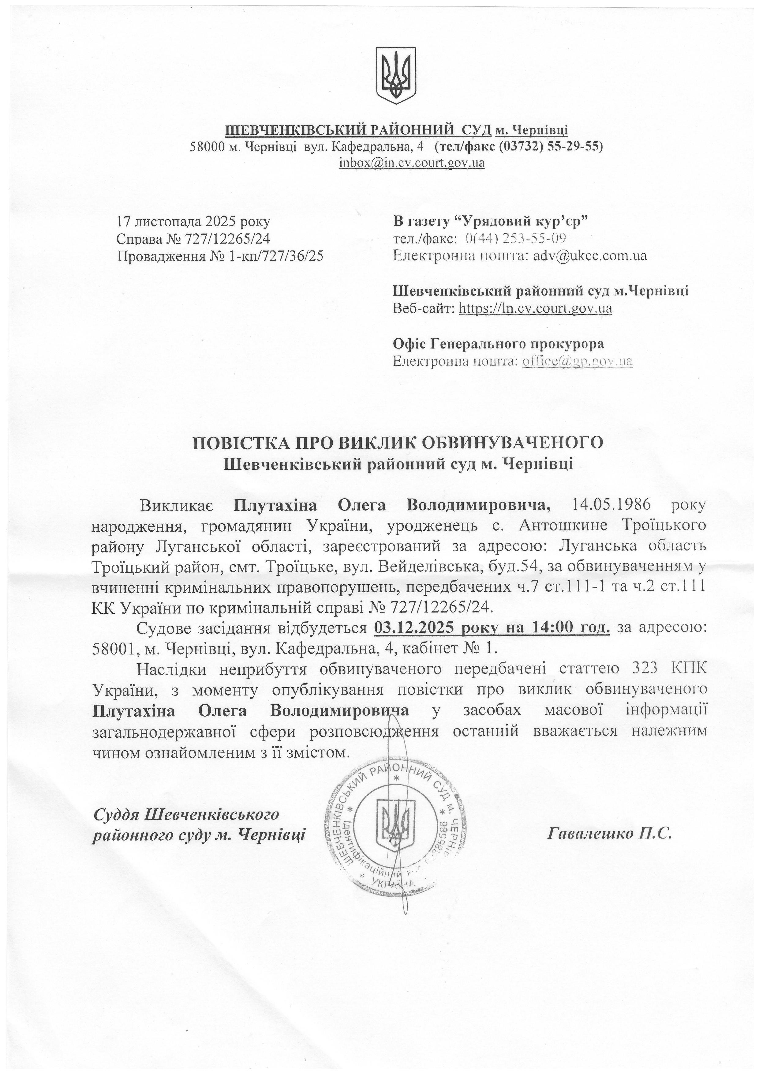 Повістка про виклик до суду Плутахіна Олега Володимировича
