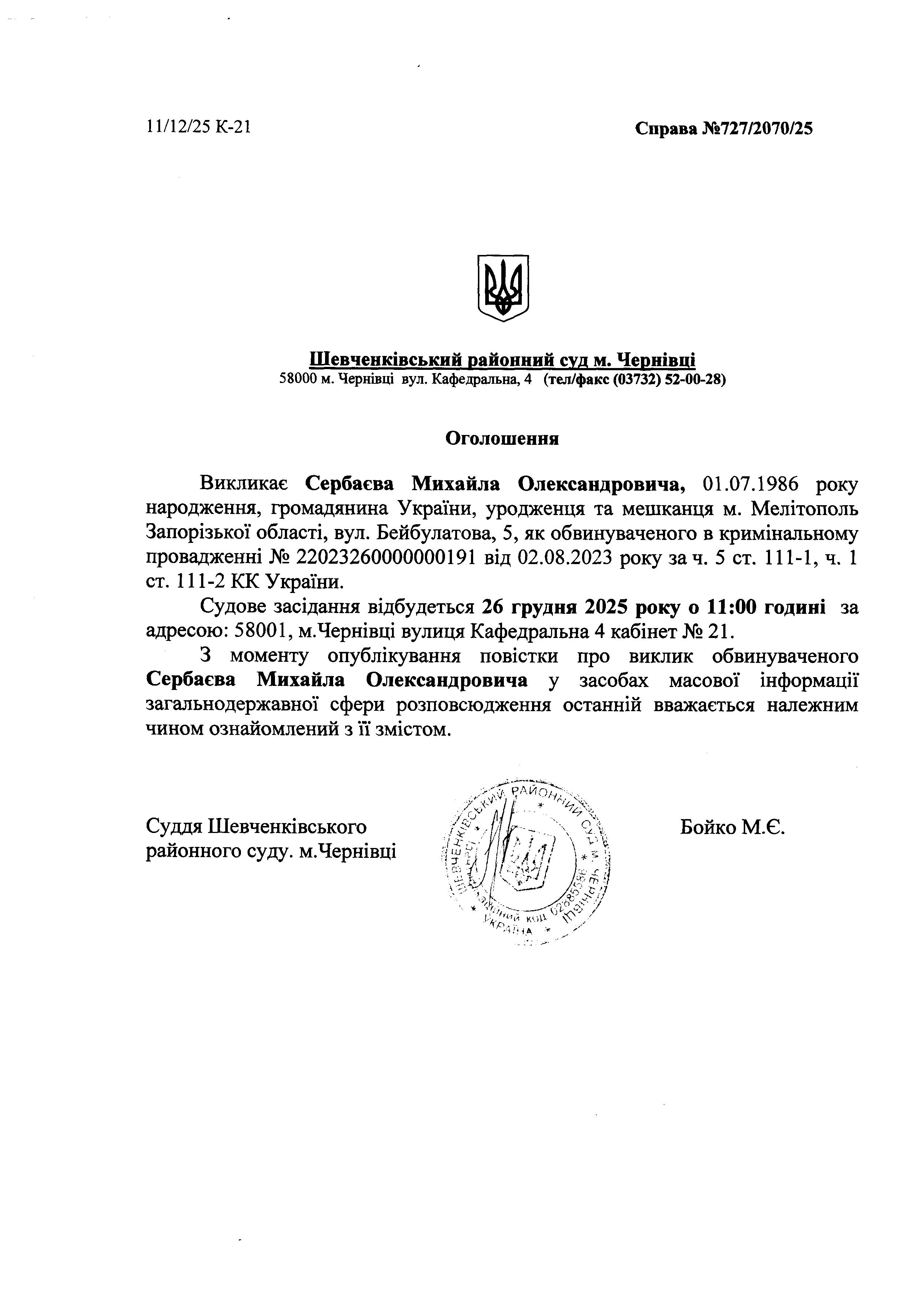 Оголошення про виклик до суду Сербаєва Михайла Олександровича
