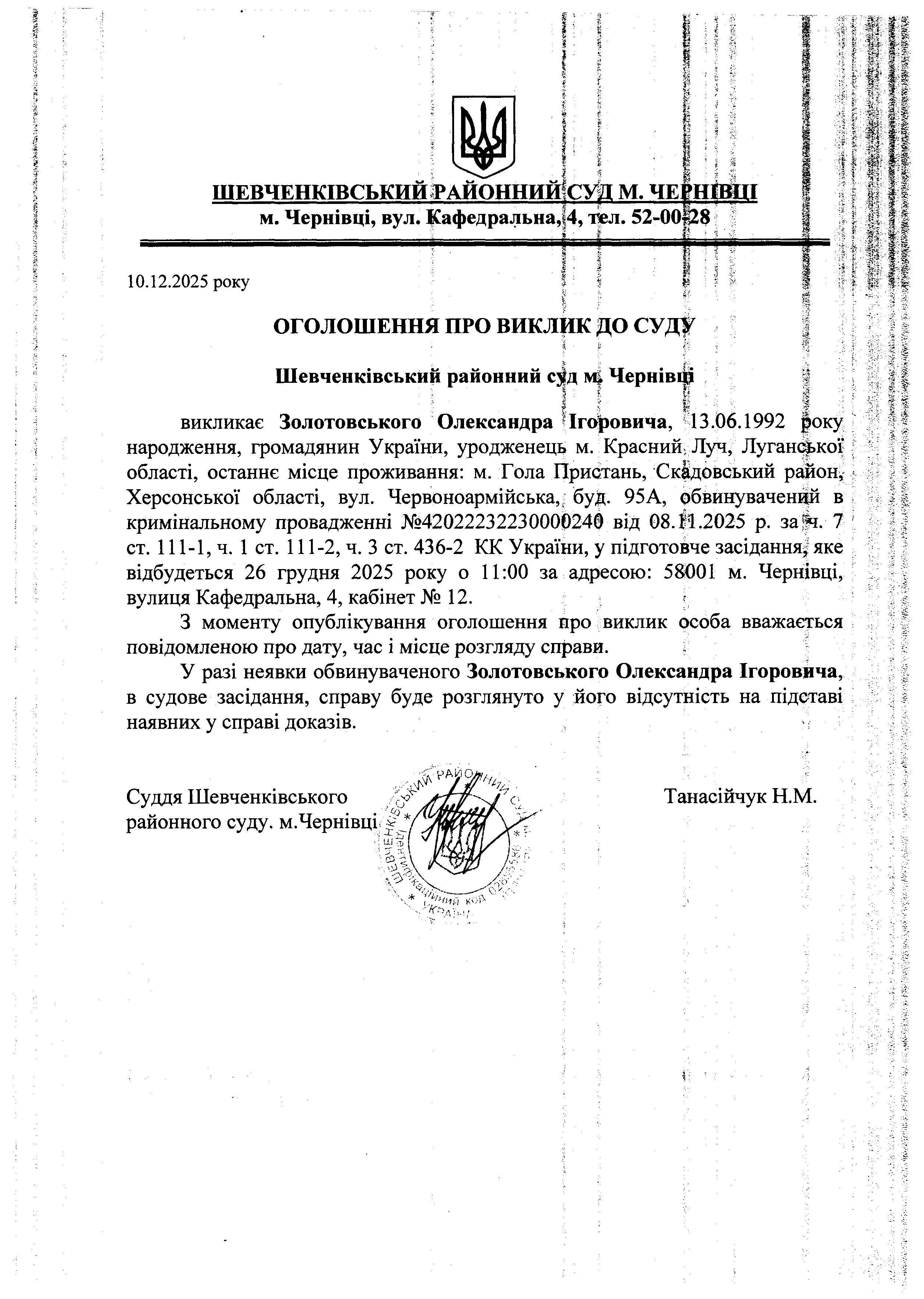 Оголошення про виклик до суду Золотовського Олександра Ігоровича