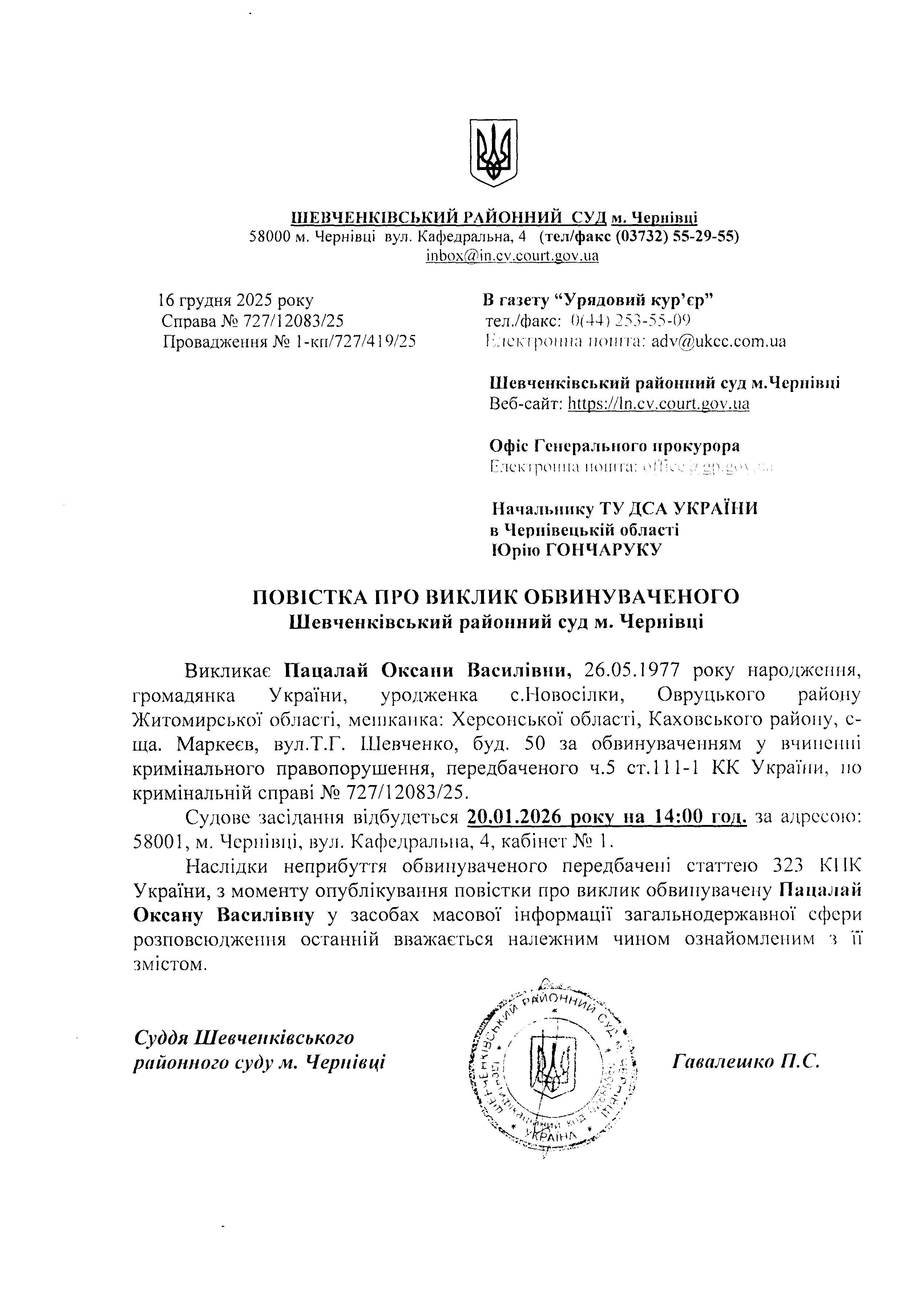 Повістка про виклик до суду Пацалай Оксану Василівну