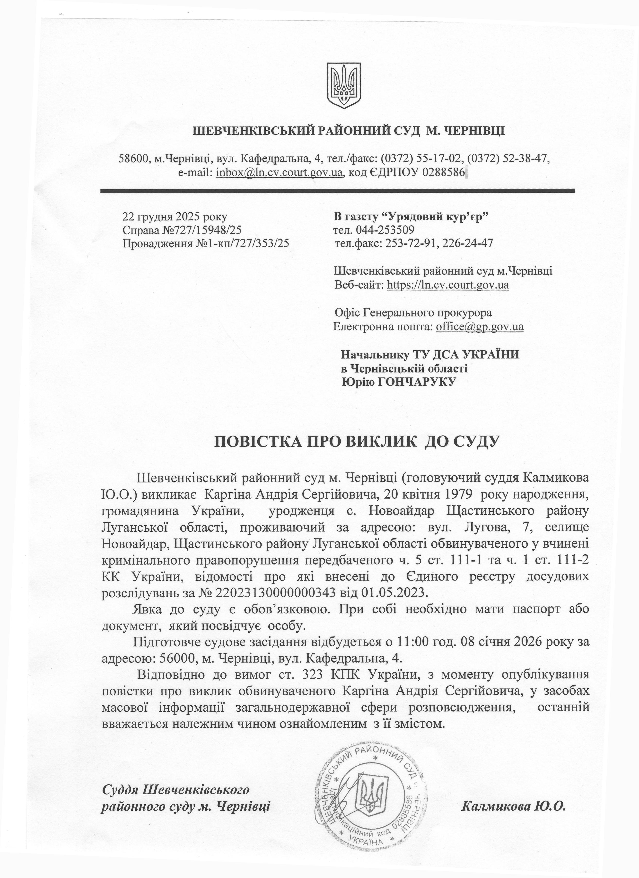 Повістка про виклик до суду Каргіна Андрія Сергійовича