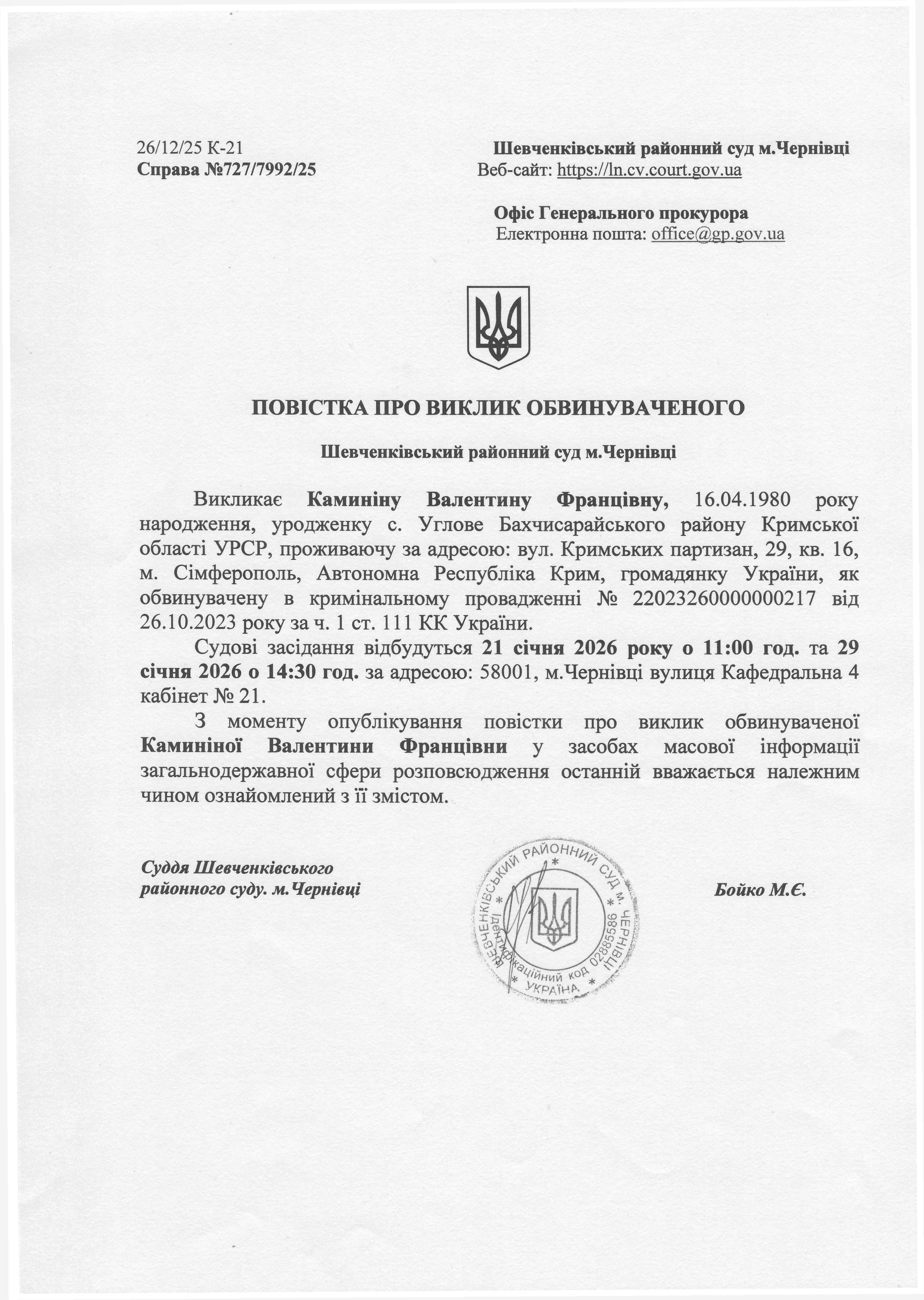 Повістка про виклик до суду Каминіну Валентину Францівну