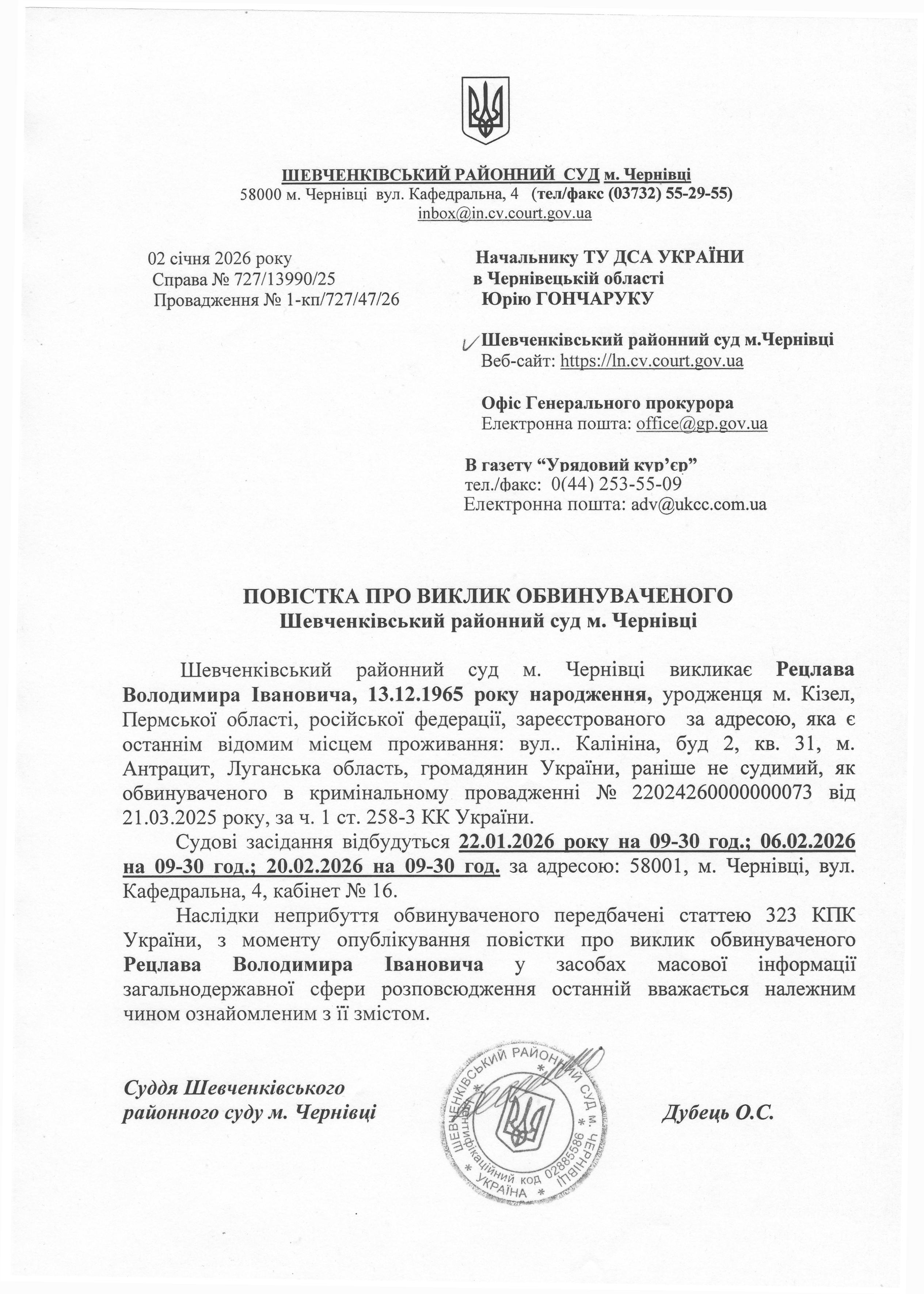 Повістка про виклик до суду Рецлава Володимира Івановича