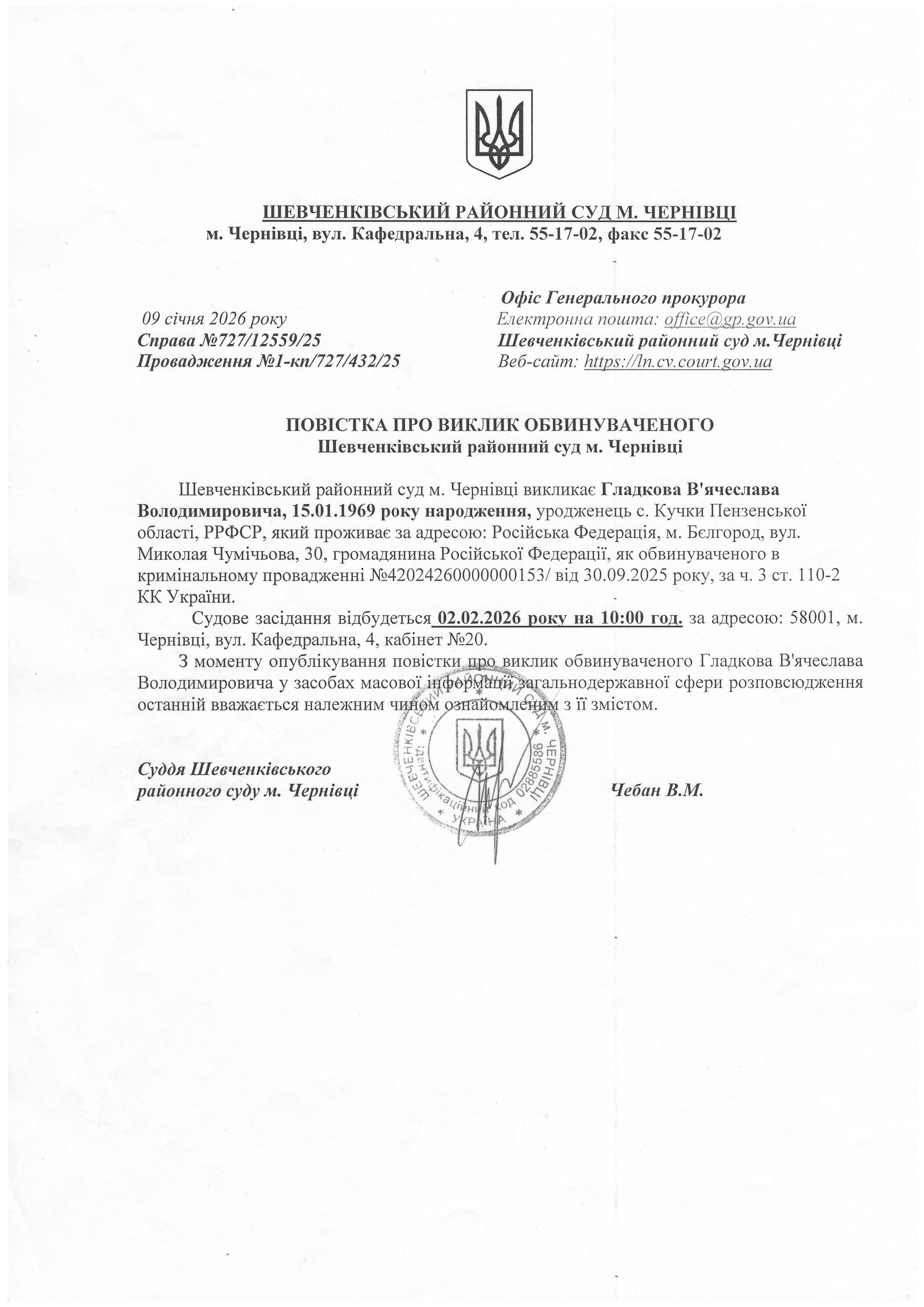 Повістка про виклик до суду Гладкова В'ячеслава Володимировича