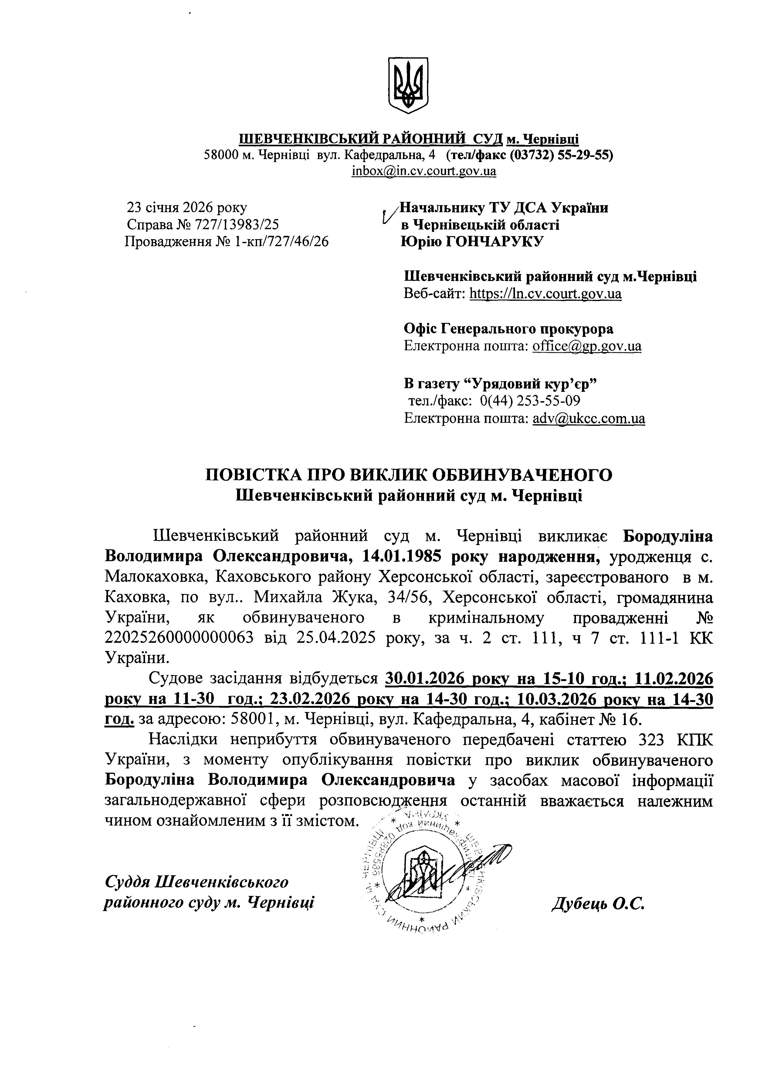 Повістка про виклик до суду Бородуліна Володимира Олександровича