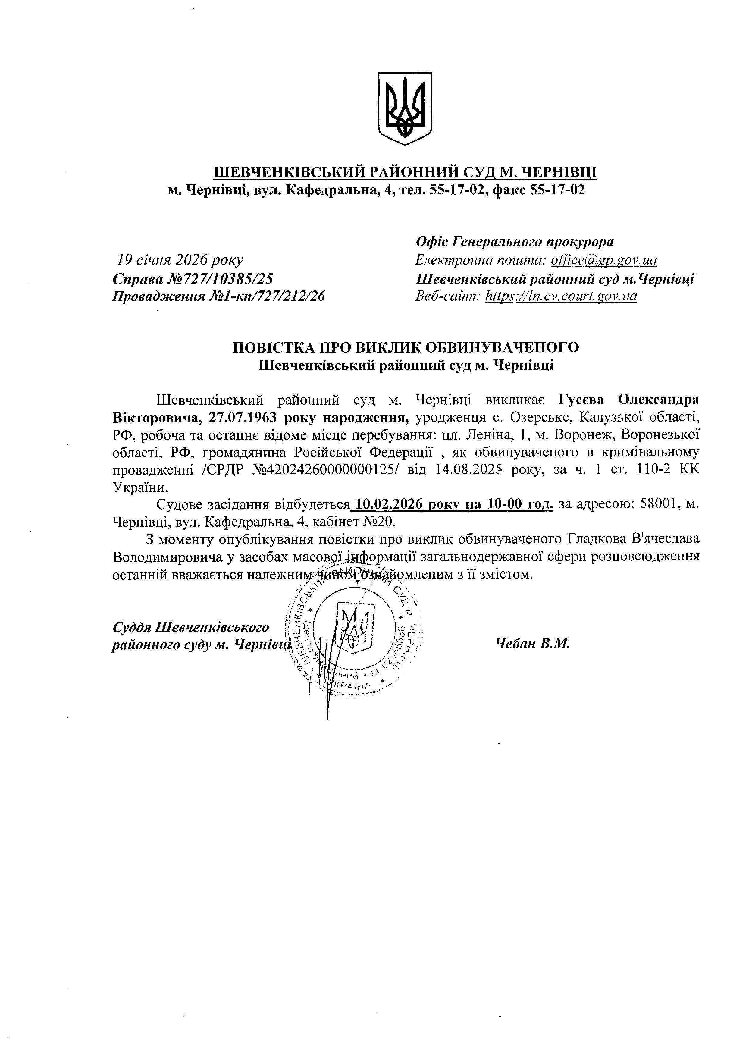 Повістка про виклик до суду Гусєва Олександра Вікторовича