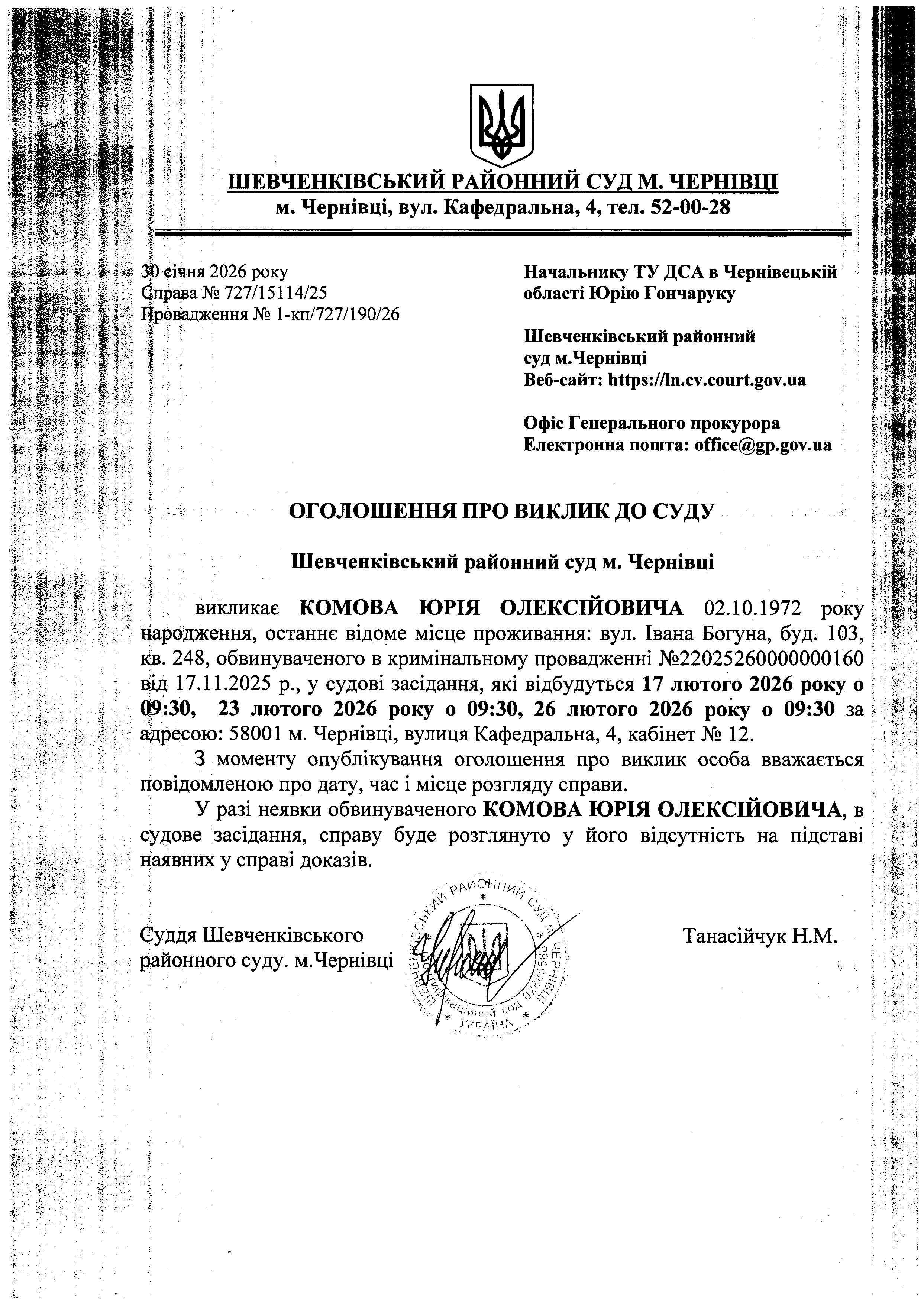 Оголошення про виклик до суду Комова Юрія Олексійовича