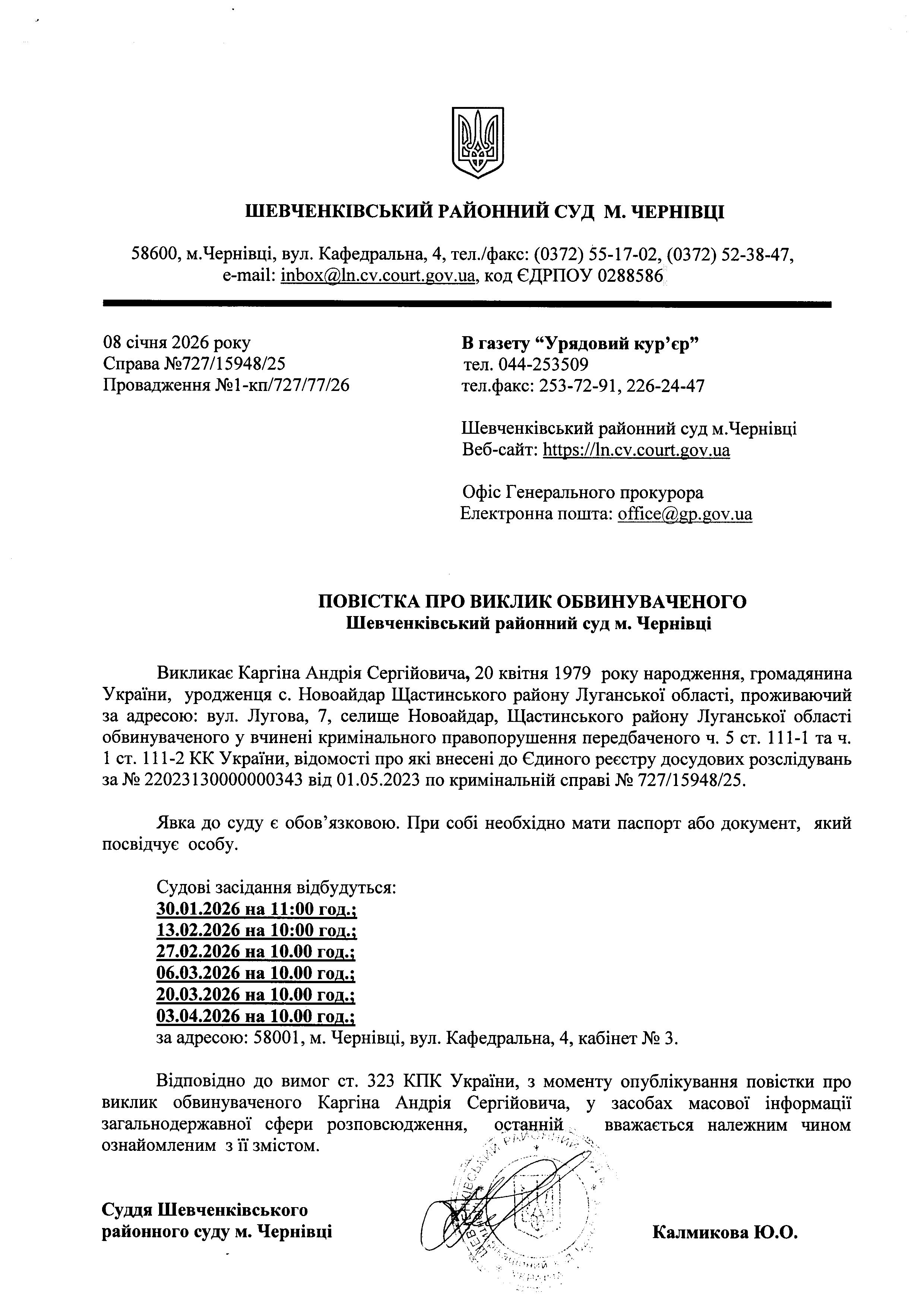 Повістка про виклик до суду Каргіна Андрія Сергійовича