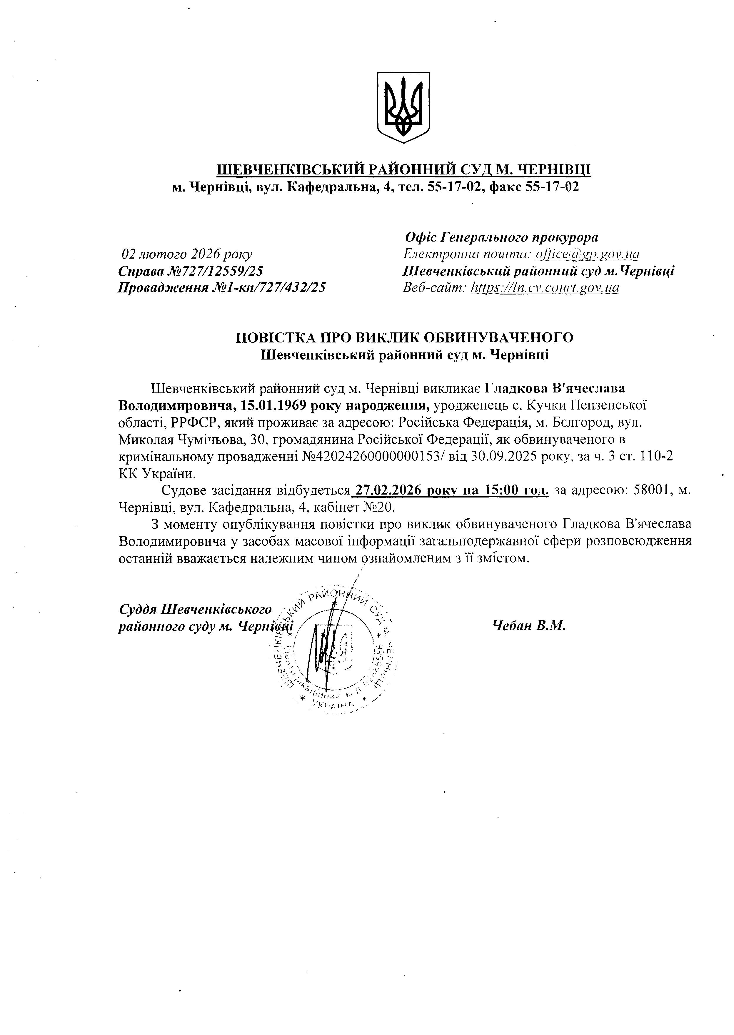 Повістка про виклик до суду Гладкова В'ячеслава Володимировича