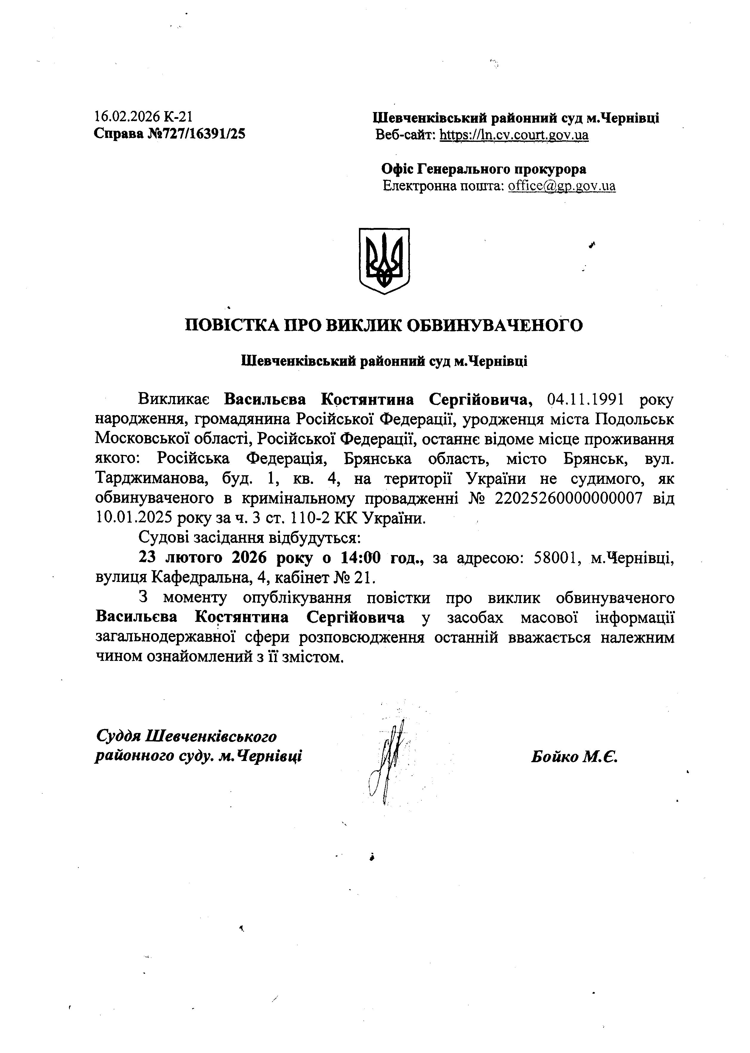 Повістка про виклик до суду Васильєва Костянтина Сергійовича