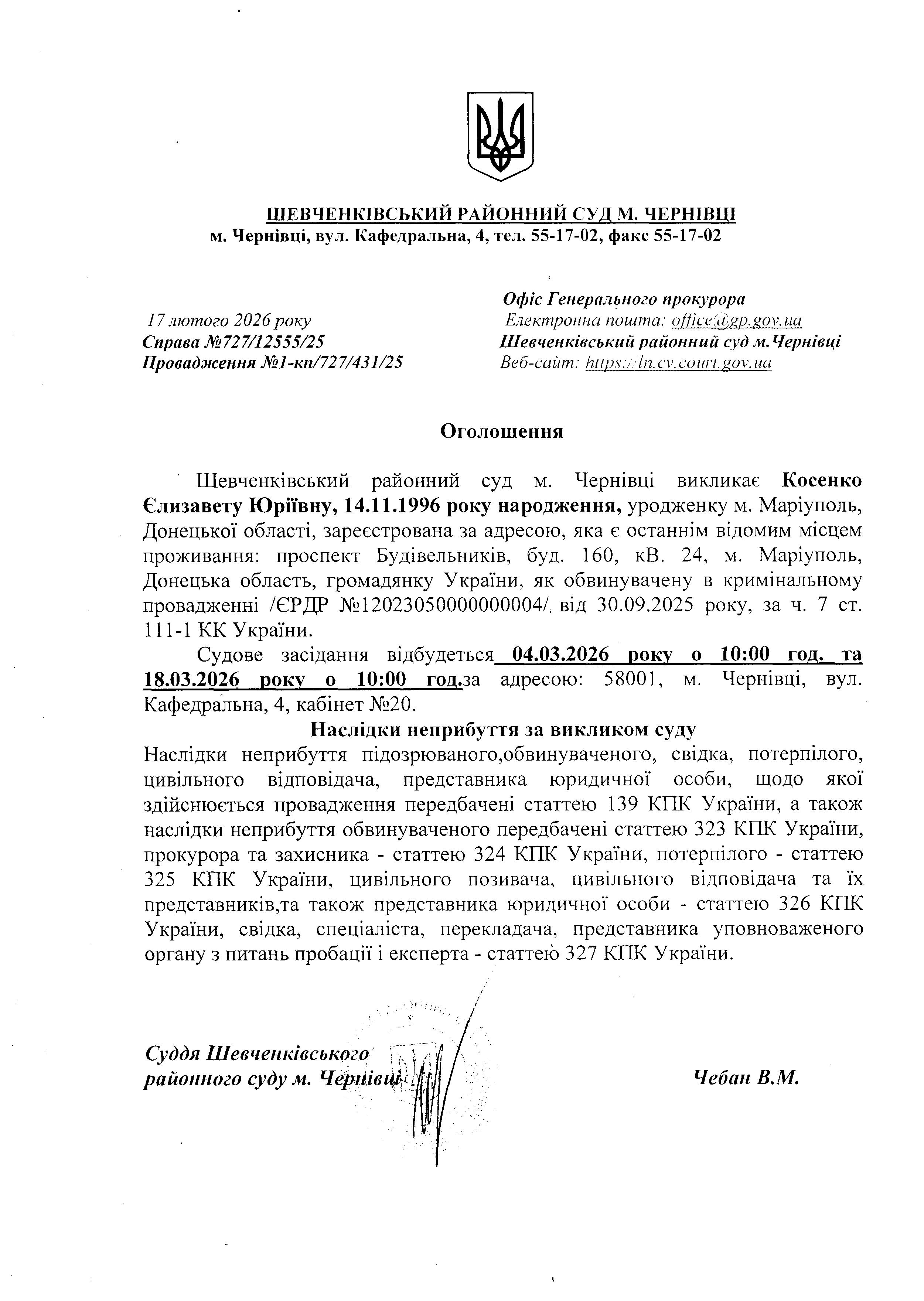 Оголошення про виклик до суду Косенко Єлизавету Юріївну