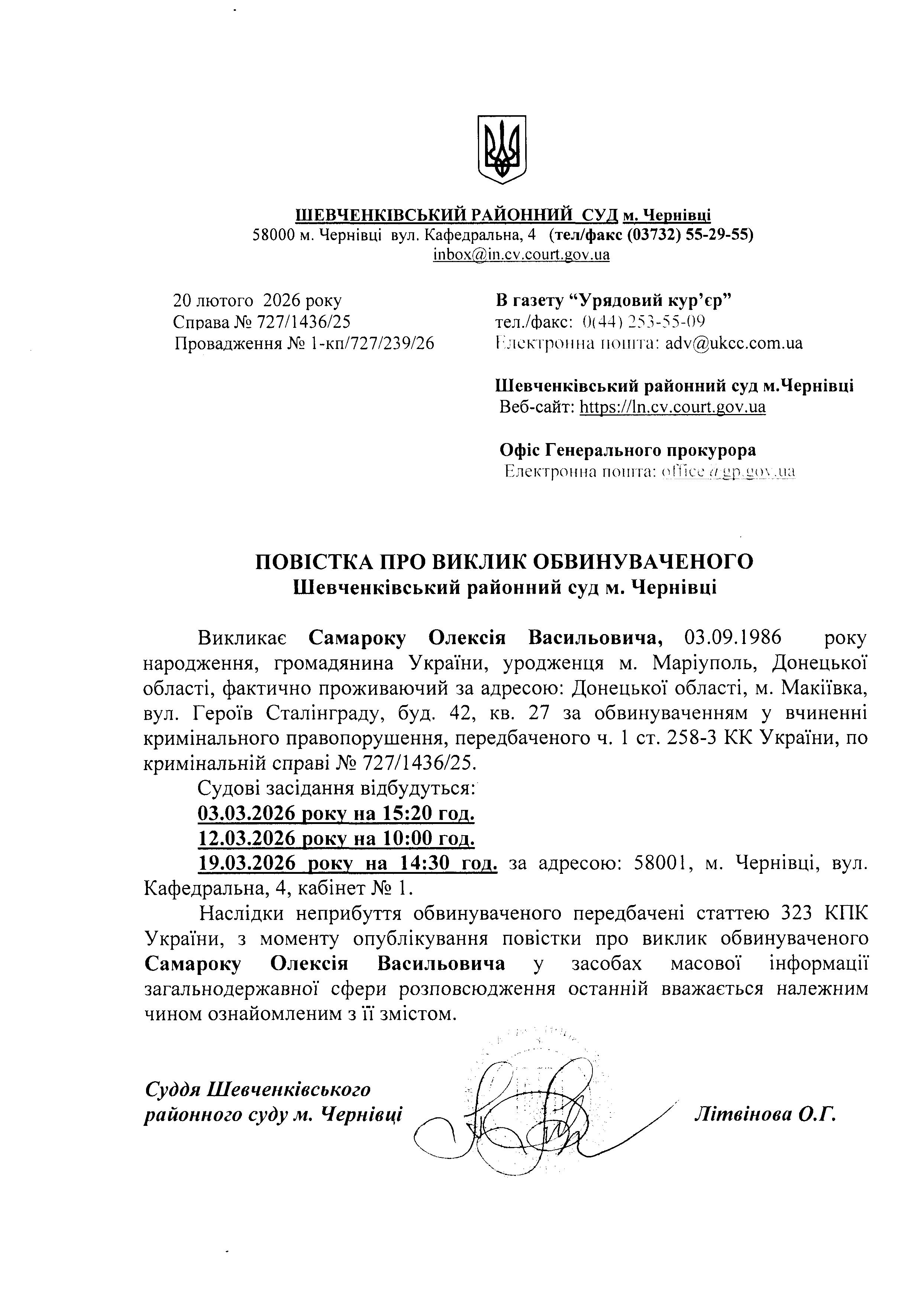 Повістка про виклик до суду Самароку Олексія Васильовича