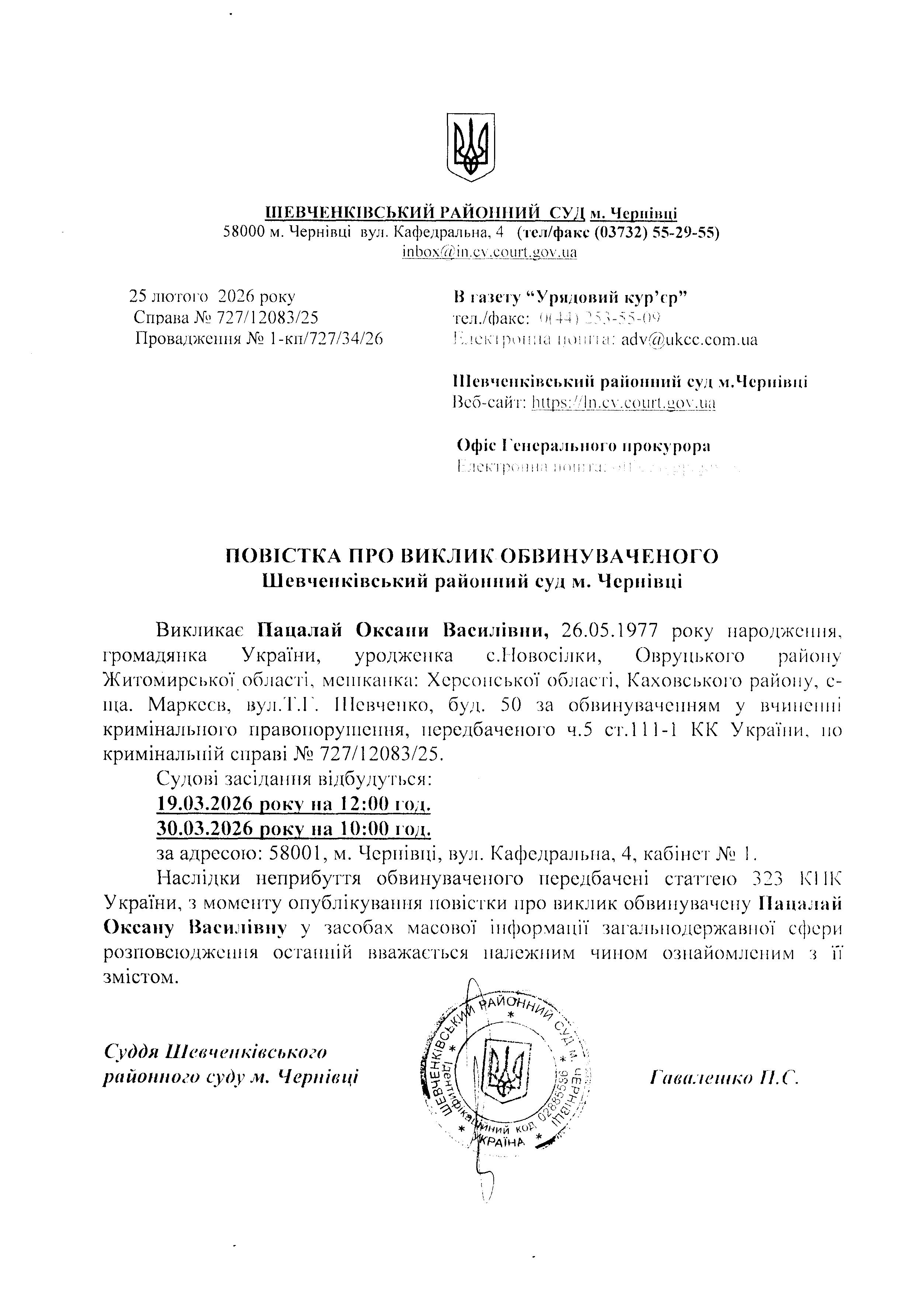 Повістка про виклик до суду Пацалай Оксану Василівну