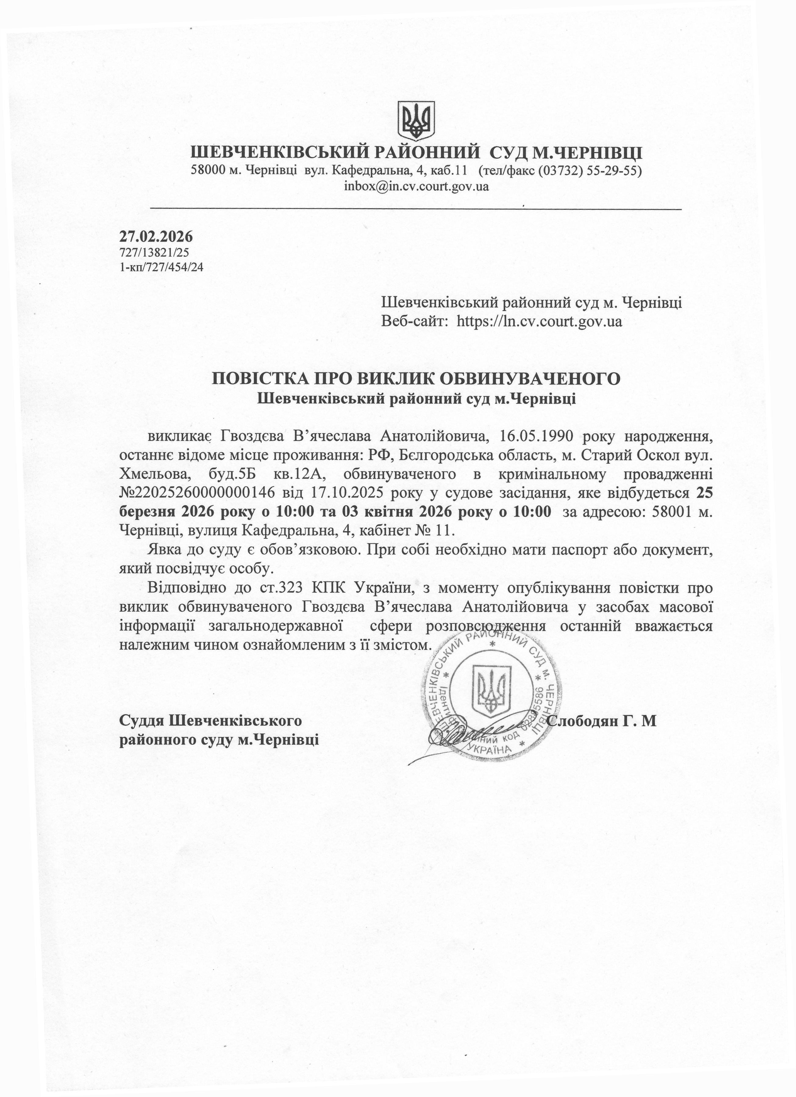 Повістка про виклик до суду Гвоздєва В'ячеслава Анатолійовича