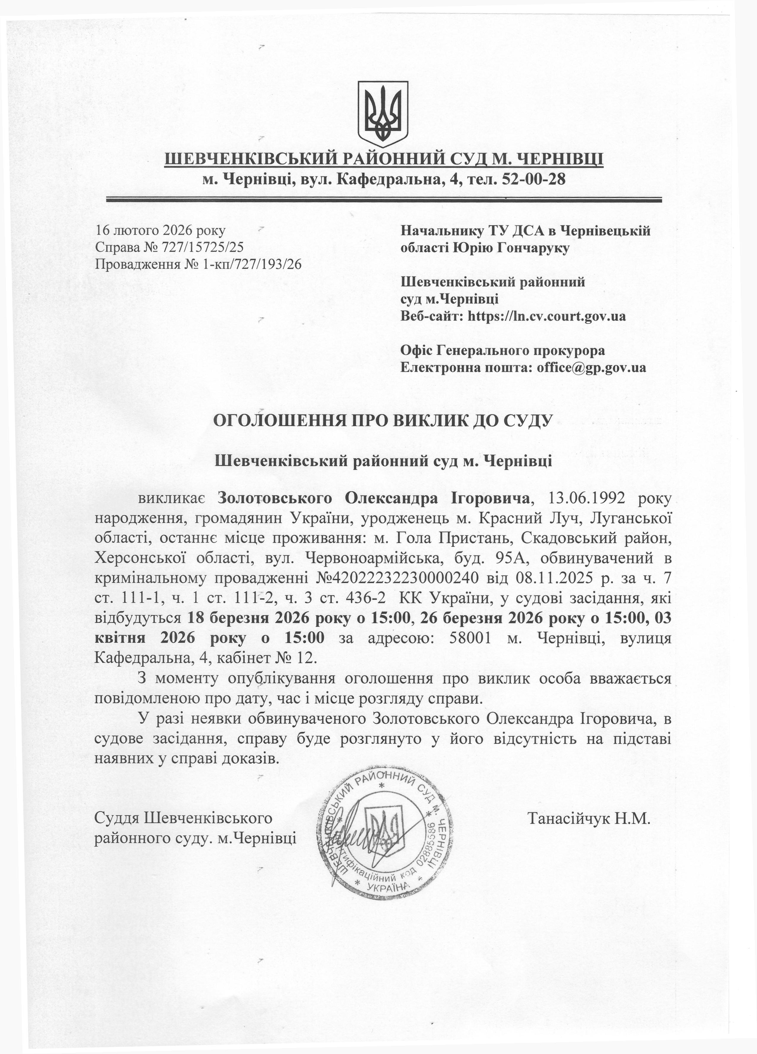 Повістка про виклик до суду Золотовського Олександра Ігоровича
