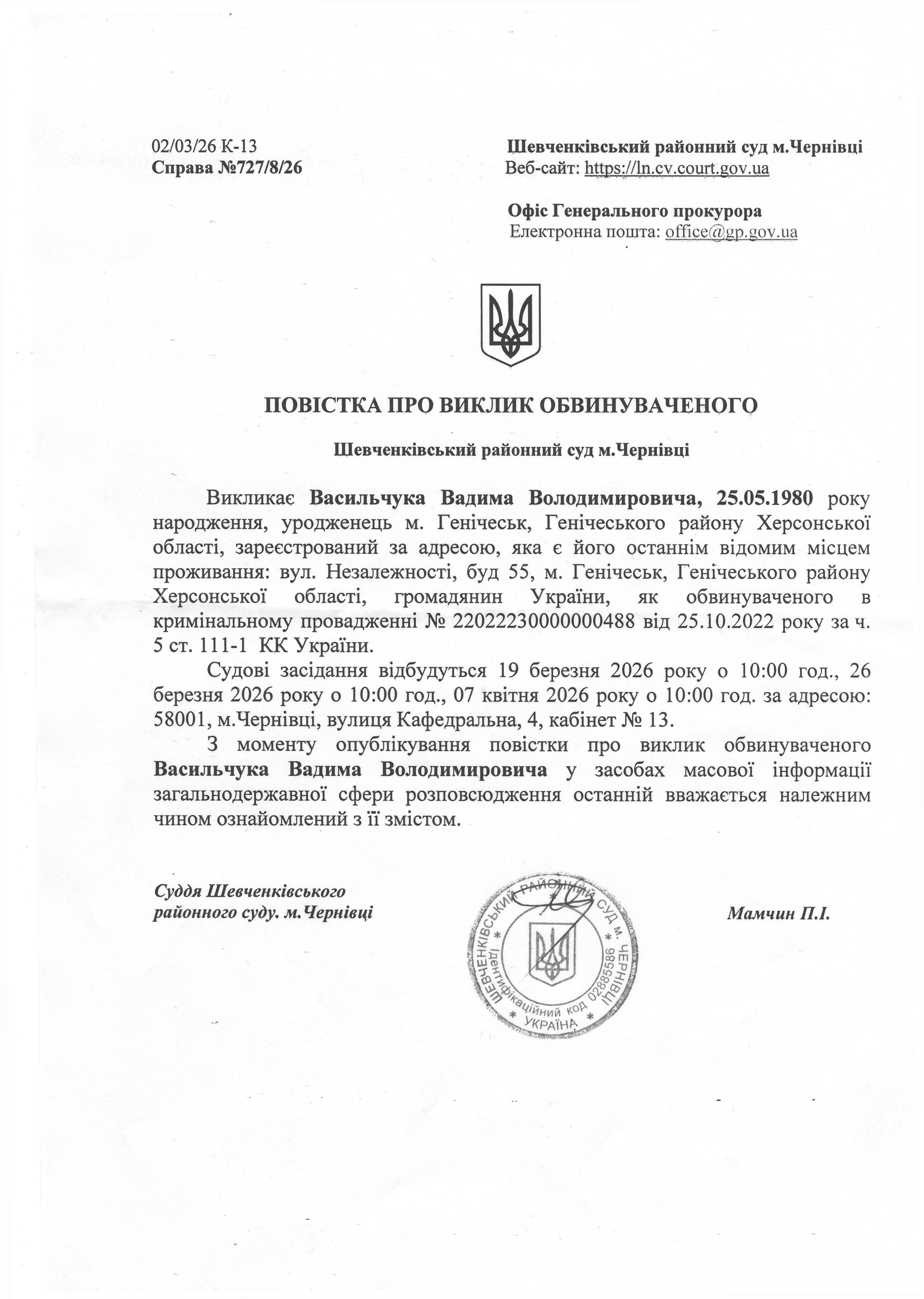 Повістка про виклик до суду Васильчука Вадима Володимировича