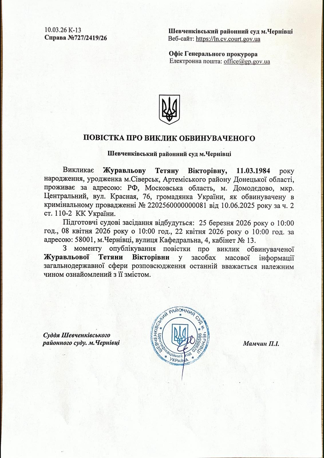 Повістка про виклик до суду Журавльову Тетяну Вікторівну