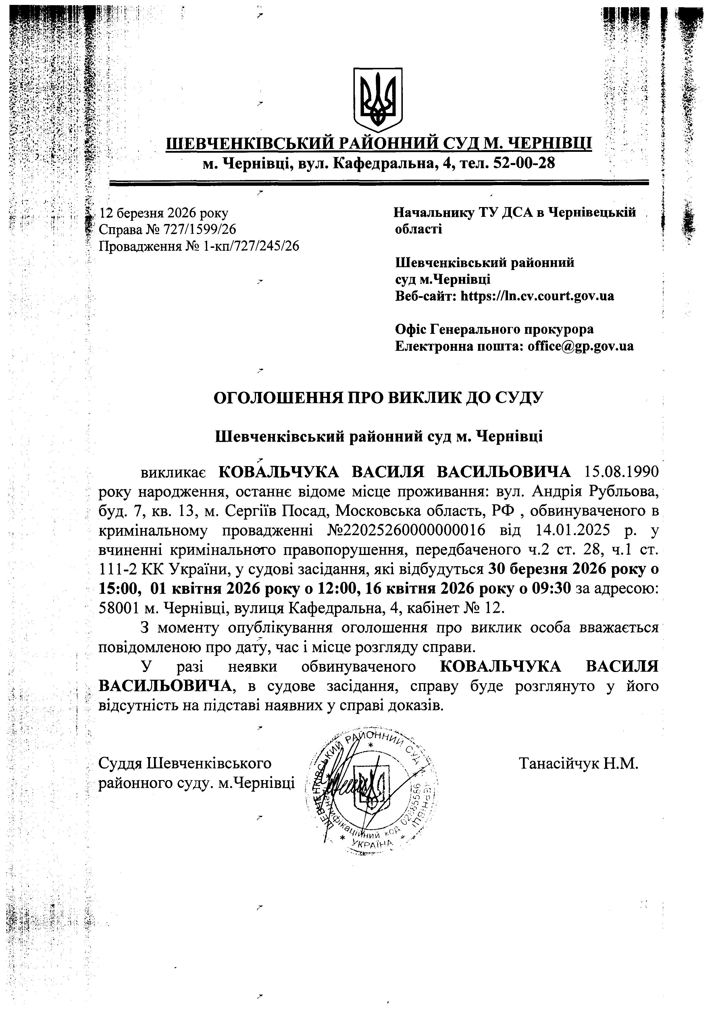Оголошення про виклик до суду Ковальчука Василя Васильовича