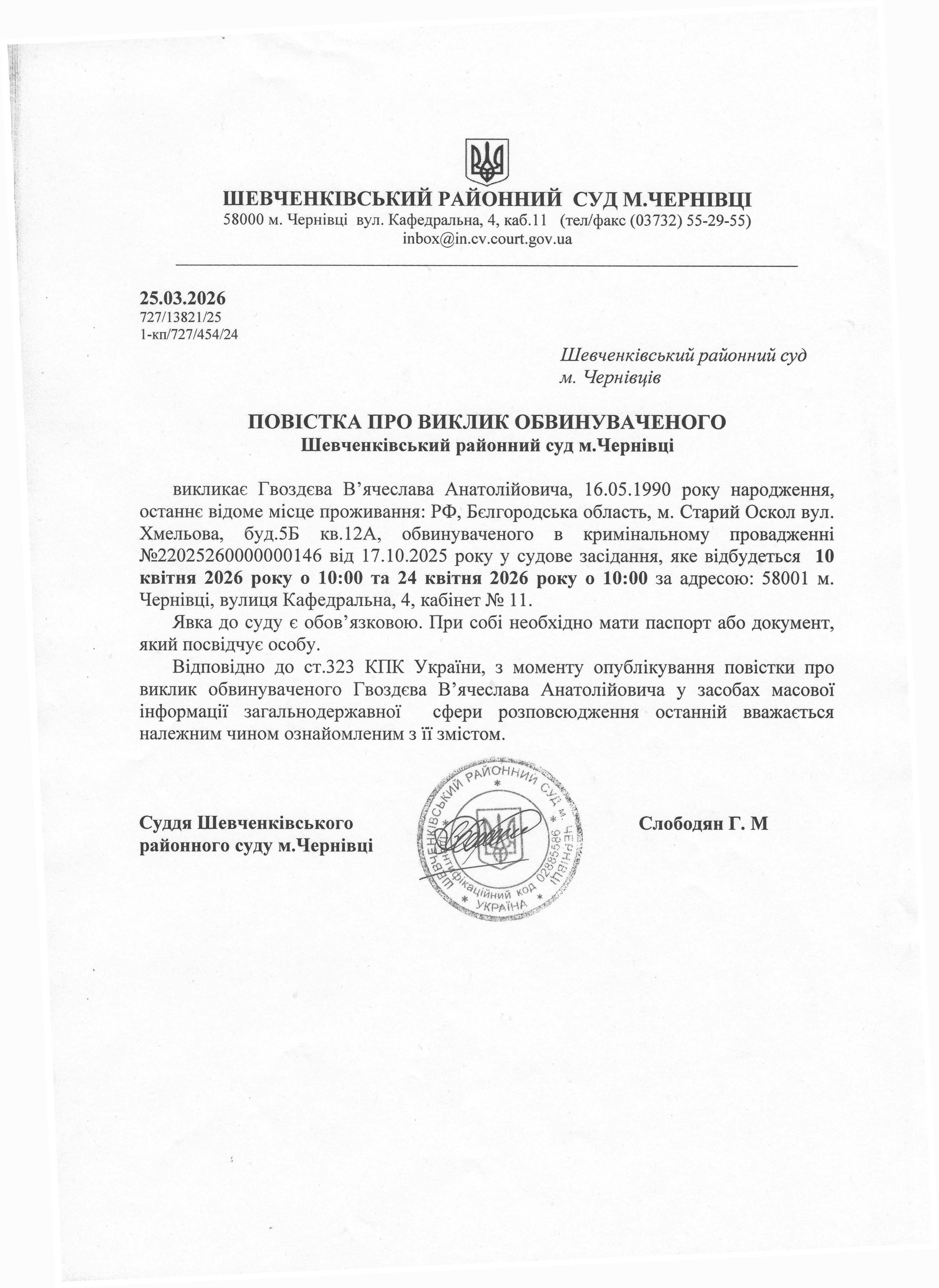 Повістка про виклик до суду Гвоздєва В'ячеслава Анатолійовича
