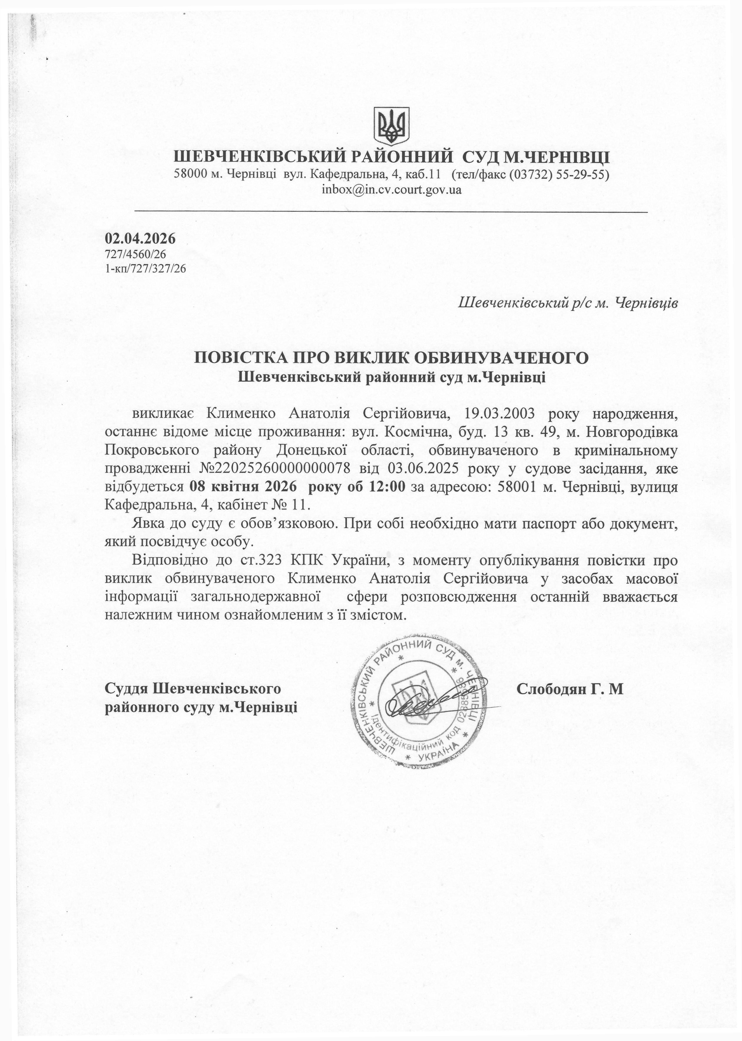 Повістка про виклик до суду Клименко Анатолія Сергійовича