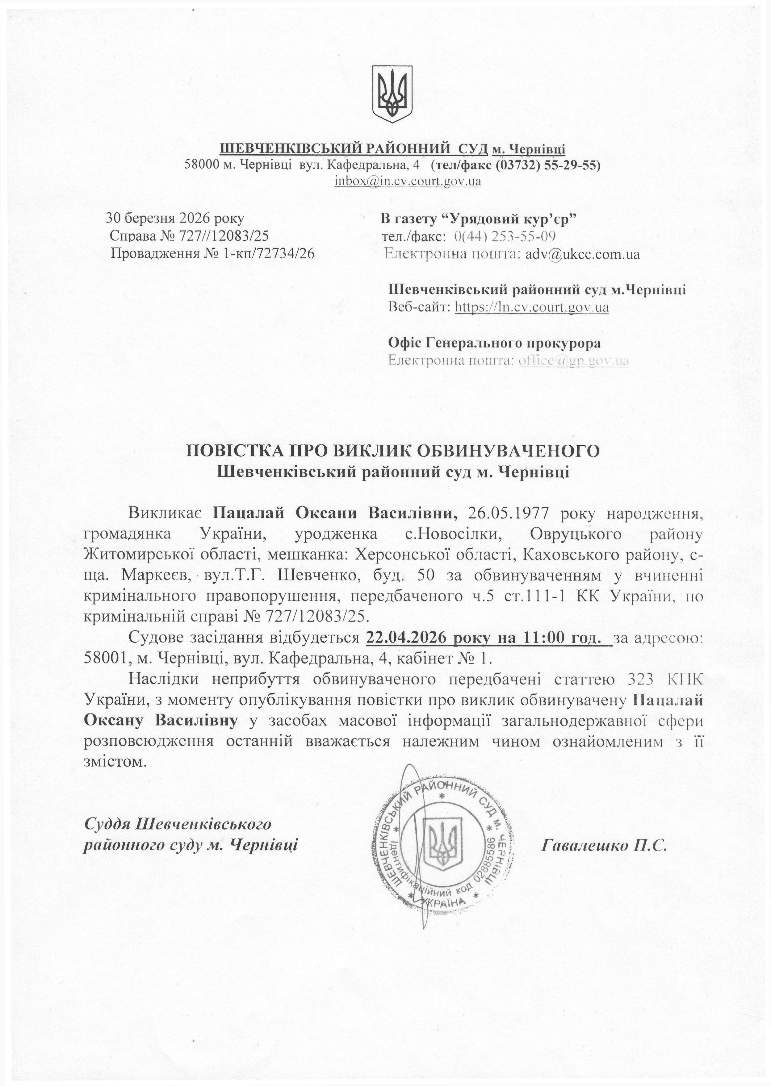 Повістка про виклик до суду Пацалай Оксану Василівну